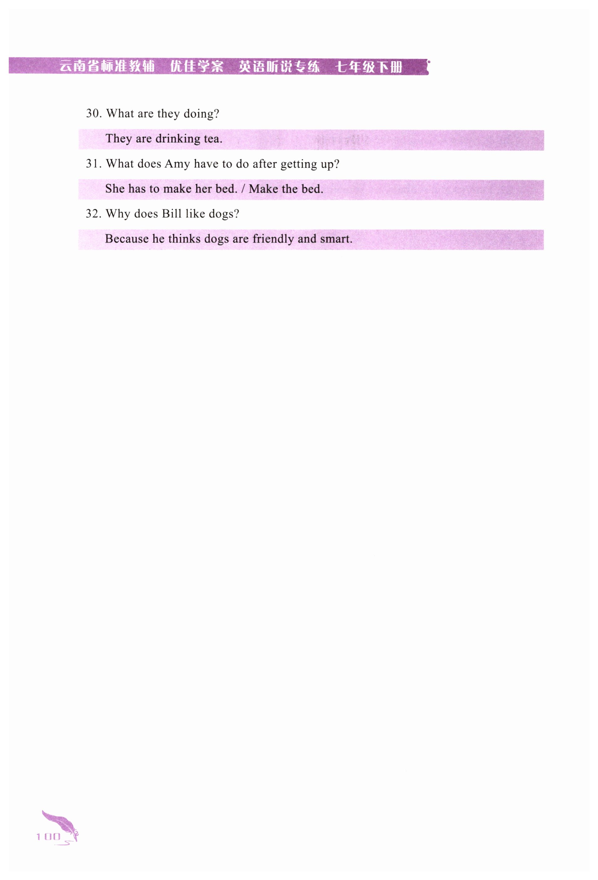 注:目前有些书本章节名称可能整理的还不是很完善,但都是按照顺序排列的,请同学们按照顺序仔细查找。练习册 2024年云南省标准教辅优佳学案七年级英语下册人教版 答案主要是用来给同学们做完题方便对答案用的,请勿直接抄袭。