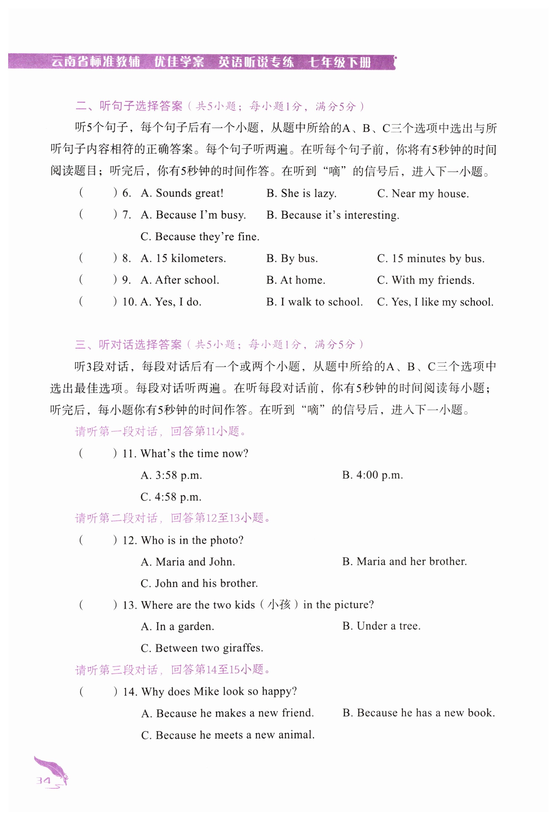 注:目前有些书本章节名称可能整理的还不是很完善,但都是按照顺序排列的,请同学们按照顺序仔细查找。练习册 2024年云南省标准教辅优佳学案七年级英语下册人教版 答案主要是用来给同学们做完题方便对答案用的,请勿直接抄袭。