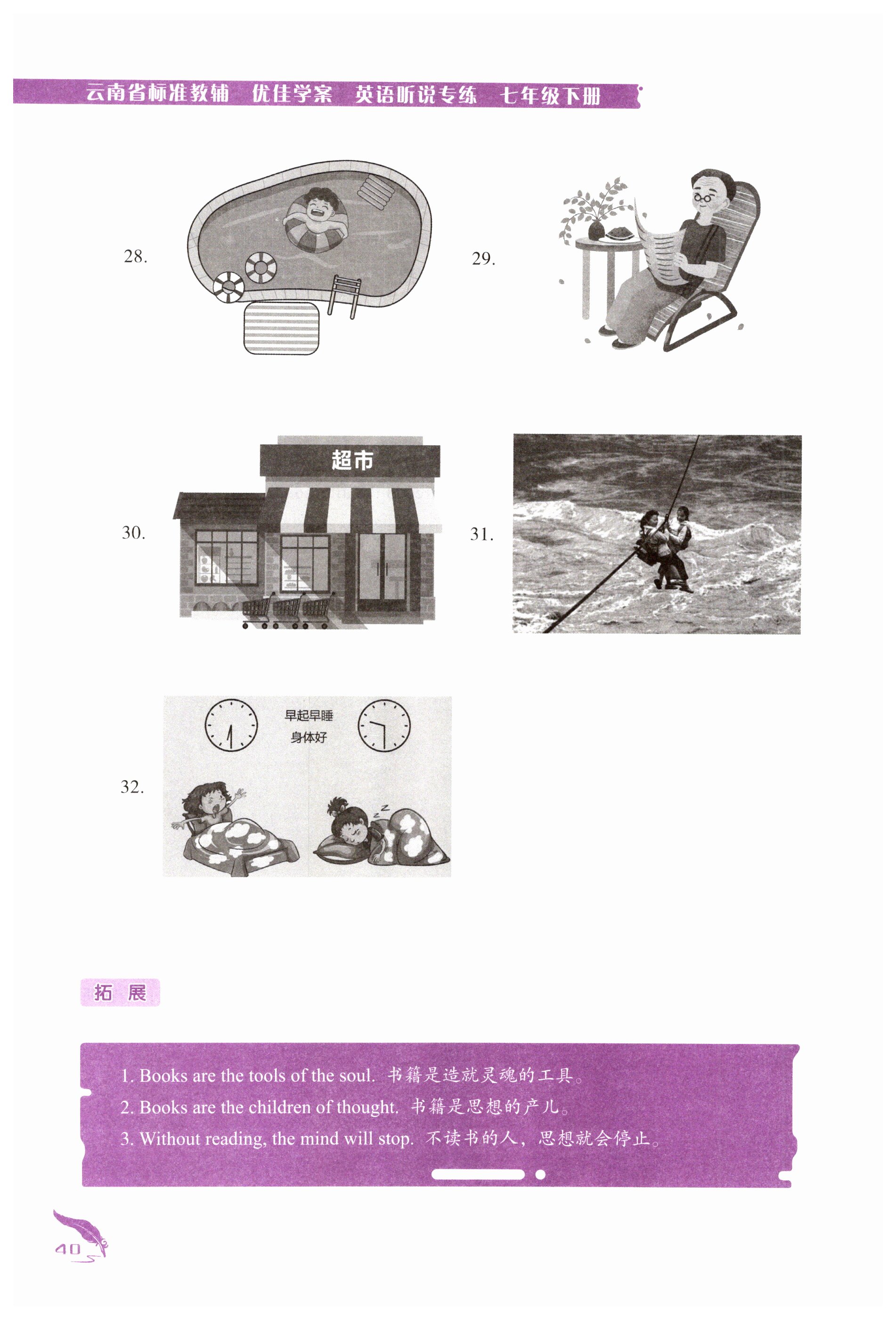 注:目前有些书本章节名称可能整理的还不是很完善,但都是按照顺序排列的,请同学们按照顺序仔细查找。练习册 2024年云南省标准教辅优佳学案七年级英语下册人教版 答案主要是用来给同学们做完题方便对答案用的,请勿直接抄袭。