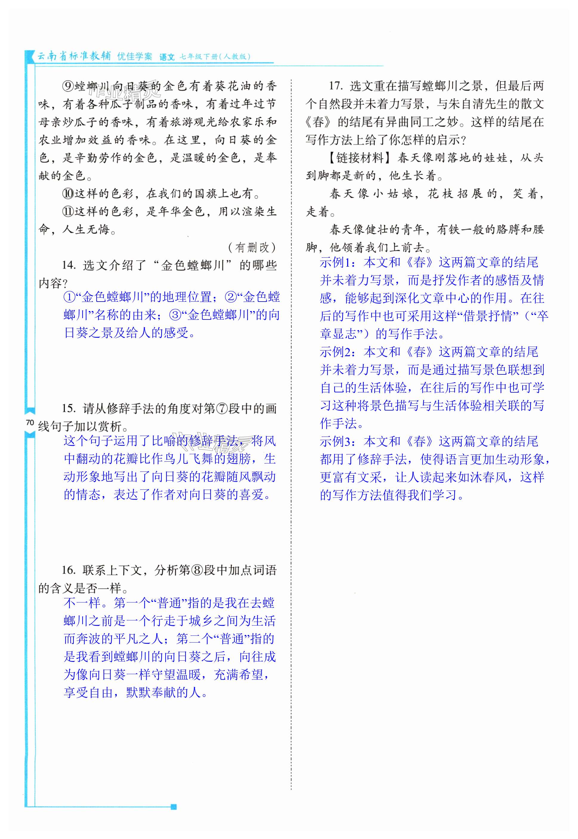 注:目前有些书本章节名称可能整理的还不是很完善,但都是按照顺序排列的,请同学们按照顺序仔细查找。练习册 2024年云南省标准教辅优佳学案七年级语文下册人教版 答案主要是用来给同学们做完题方便对答案用的,请勿直接抄袭。