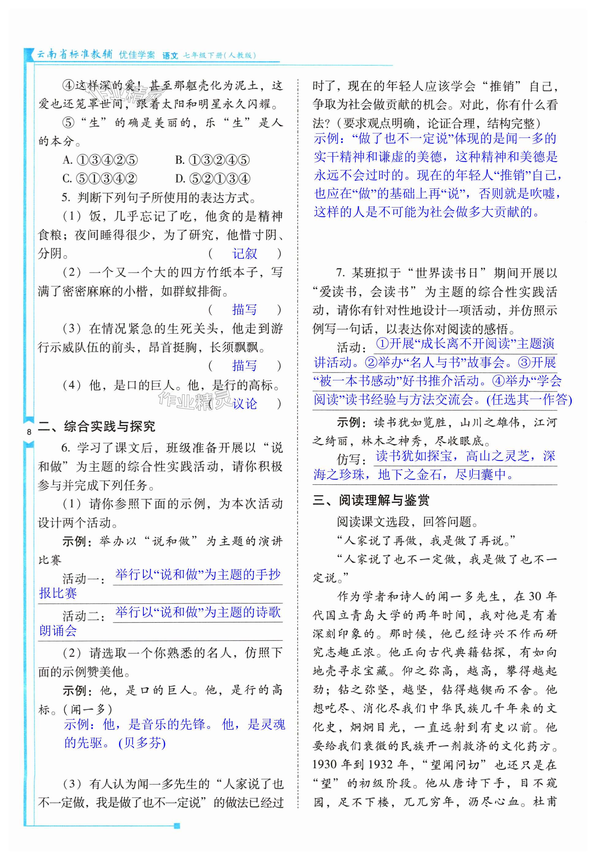注:目前有些书本章节名称可能整理的还不是很完善,但都是按照顺序排列的,请同学们按照顺序仔细查找。练习册 2024年云南省标准教辅优佳学案七年级语文下册人教版 答案主要是用来给同学们做完题方便对答案用的,请勿直接抄袭。