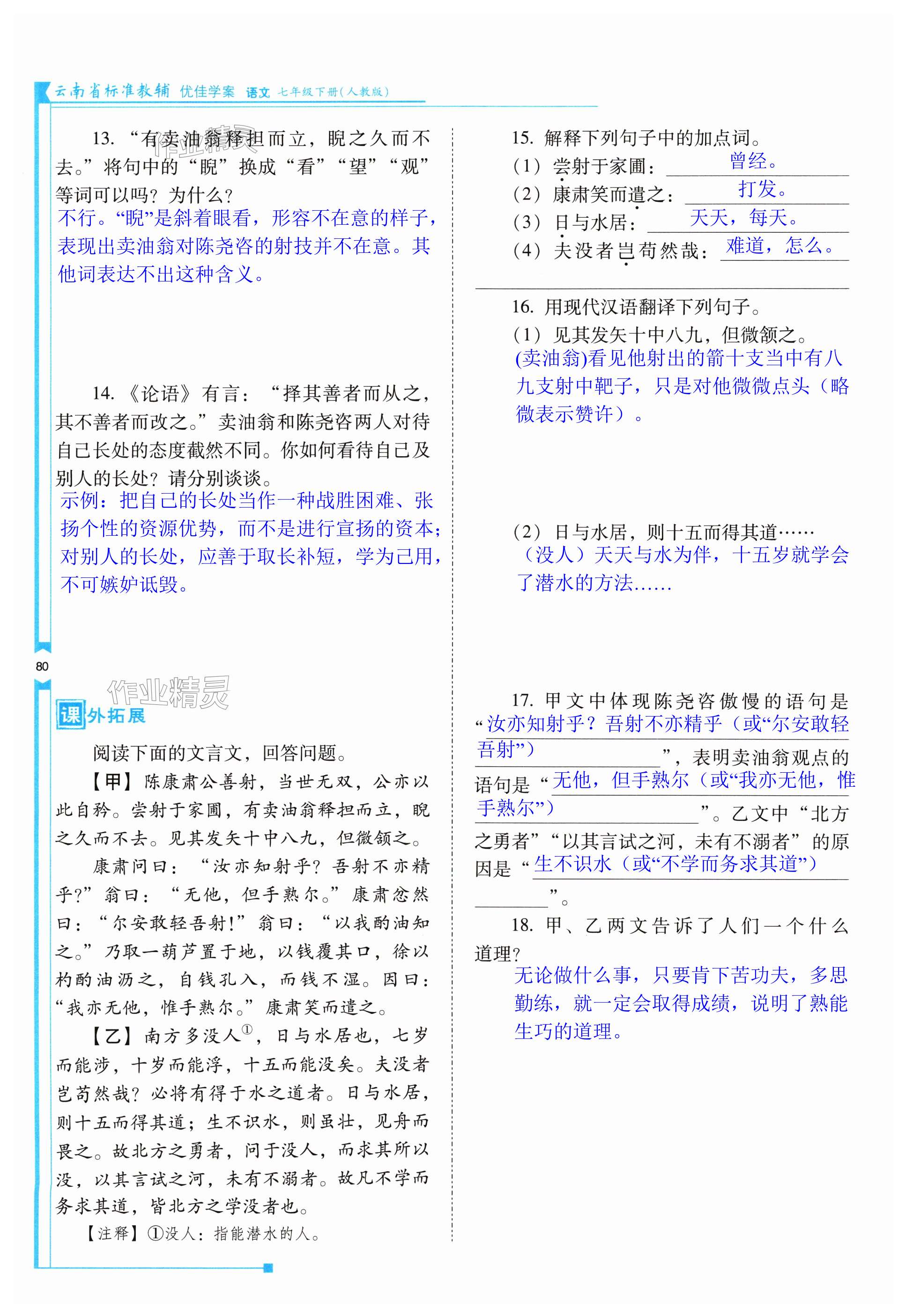 注:目前有些书本章节名称可能整理的还不是很完善,但都是按照顺序排列的,请同学们按照顺序仔细查找。练习册 2024年云南省标准教辅优佳学案七年级语文下册人教版 答案主要是用来给同学们做完题方便对答案用的,请勿直接抄袭。