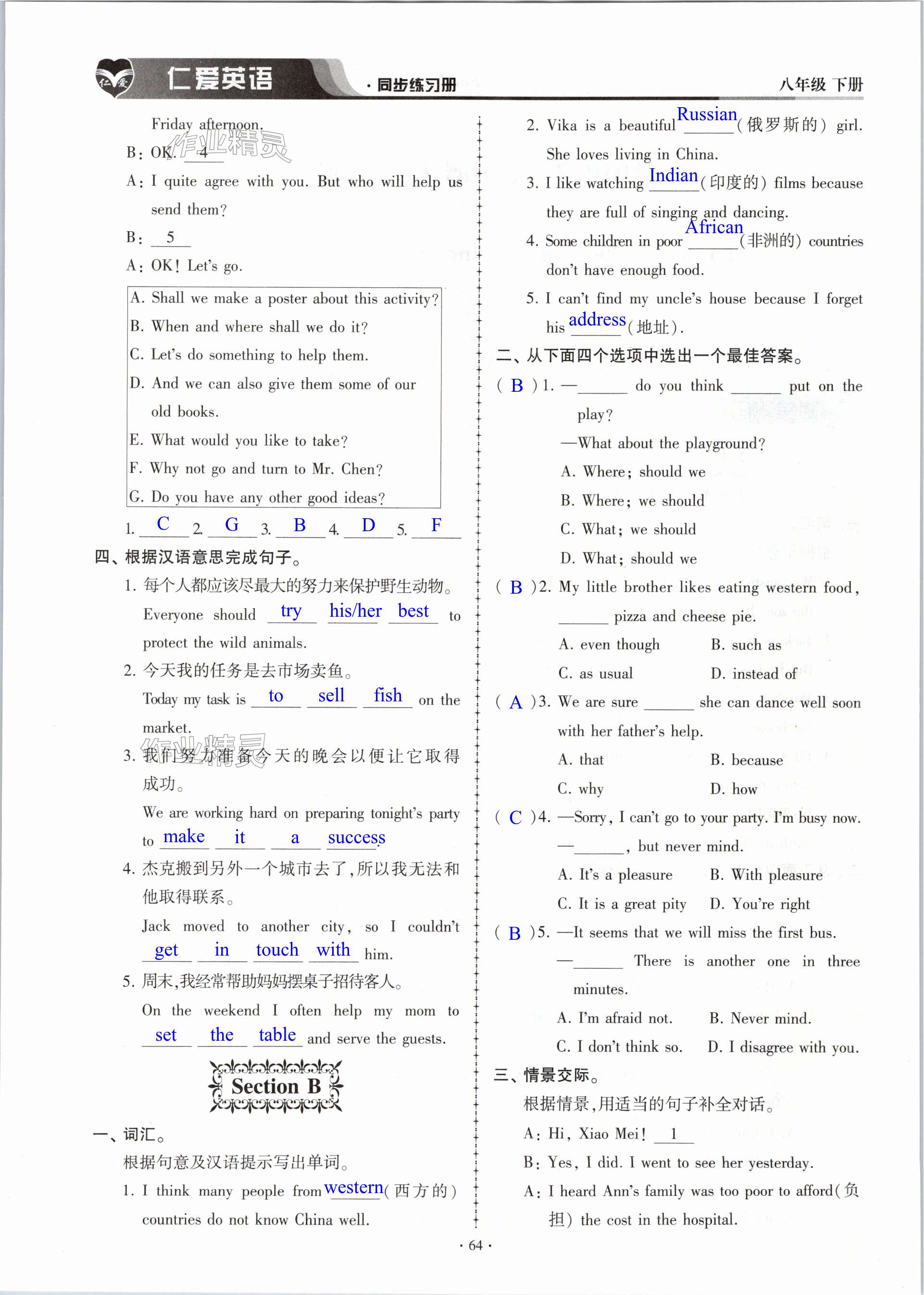 注:目前有些书本章节名称可能整理的还不是很完善,但都是按照顺序排列的,请同学们按照顺序仔细查找。练习册 2024年仁爱英语同步练习册八年级下册仁爱版内蒙古专版 答案主要是用来给同学们做完题方便对答案用的,请勿直接抄袭。