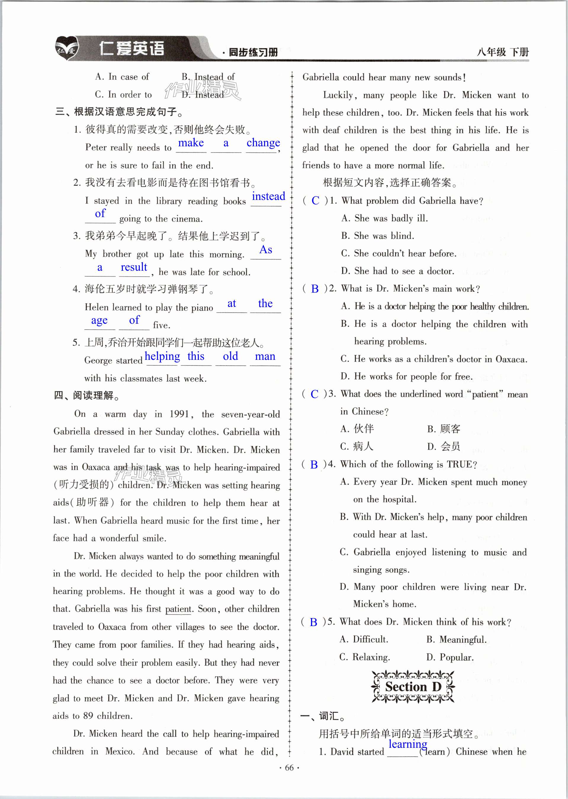 注:目前有些书本章节名称可能整理的还不是很完善,但都是按照顺序排列的,请同学们按照顺序仔细查找。练习册 2024年仁爱英语同步练习册八年级下册仁爱版内蒙古专版 答案主要是用来给同学们做完题方便对答案用的,请勿直接抄袭。