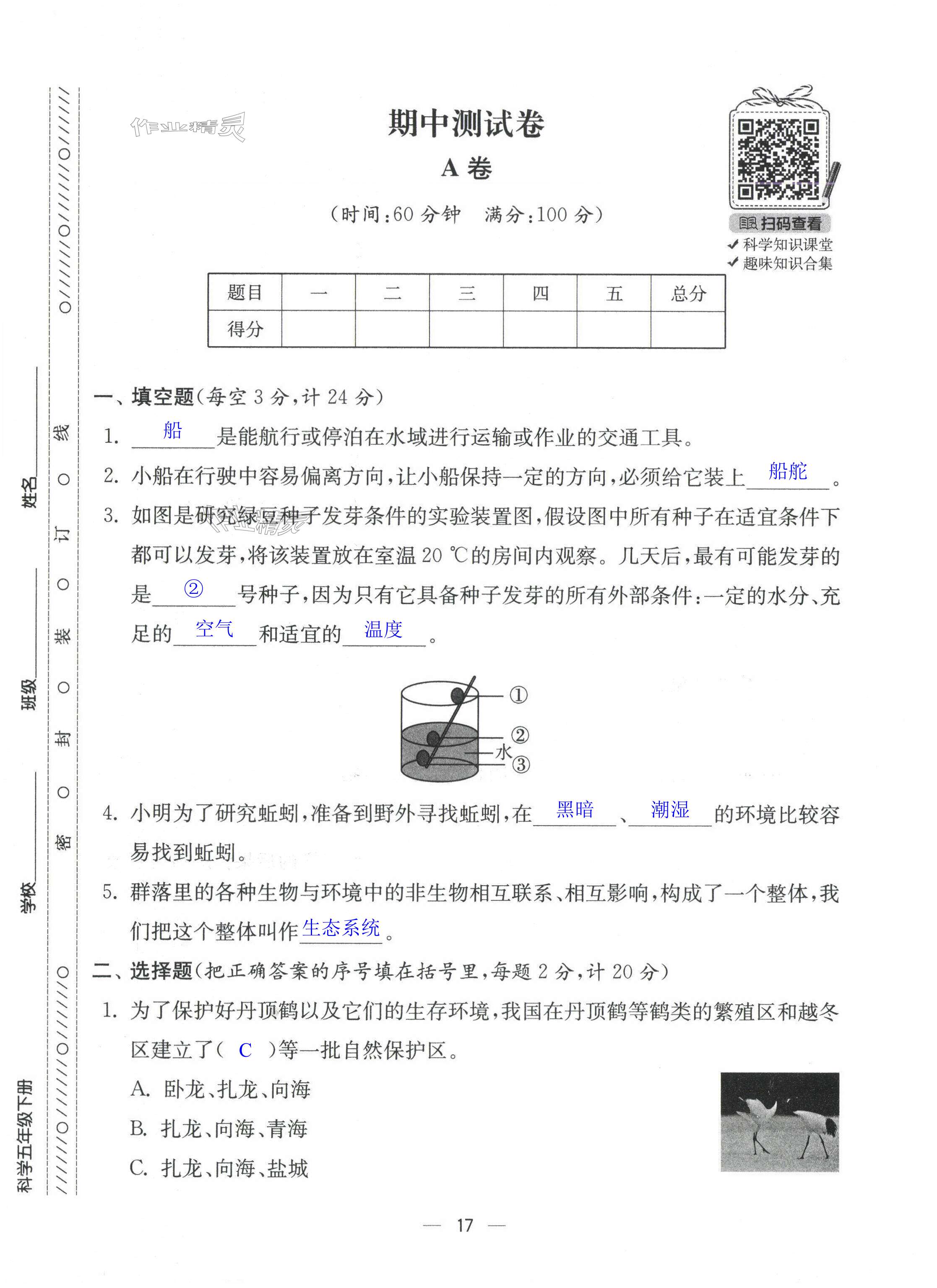 注:目前有些书本章节名称可能整理的还不是很完善,但都是按照顺序排列的,请同学们按照顺序仔细查找。练习册 2024年江苏好卷五年级科学下册教科版 答案主要是用来给同学们做完题方便对答案用的,请勿直接抄袭。