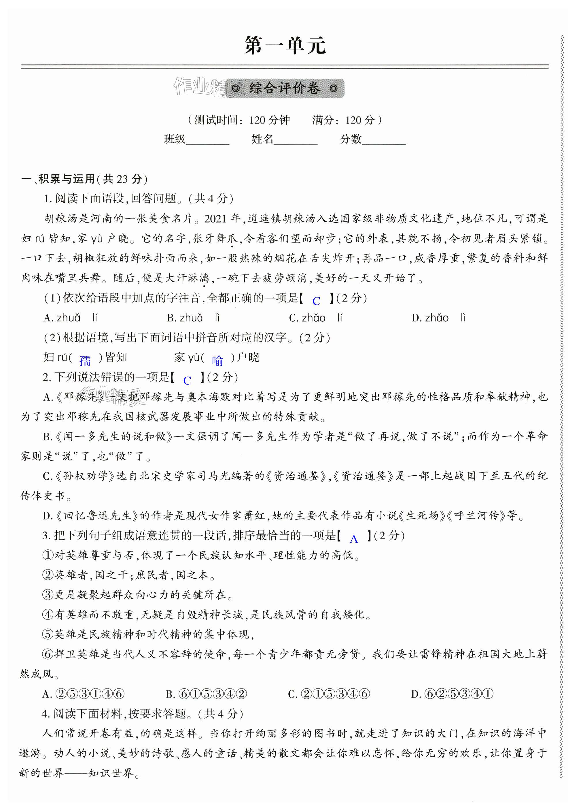 注:目前有些书本章节名称可能整理的还不是很完善,但都是按照顺序排列的,请同学们按照顺序仔细查找。练习册 2024年节节高大象出版社七年级语文下册人教版 答案主要是用来给同学们做完题方便对答案用的,请勿直接抄袭。