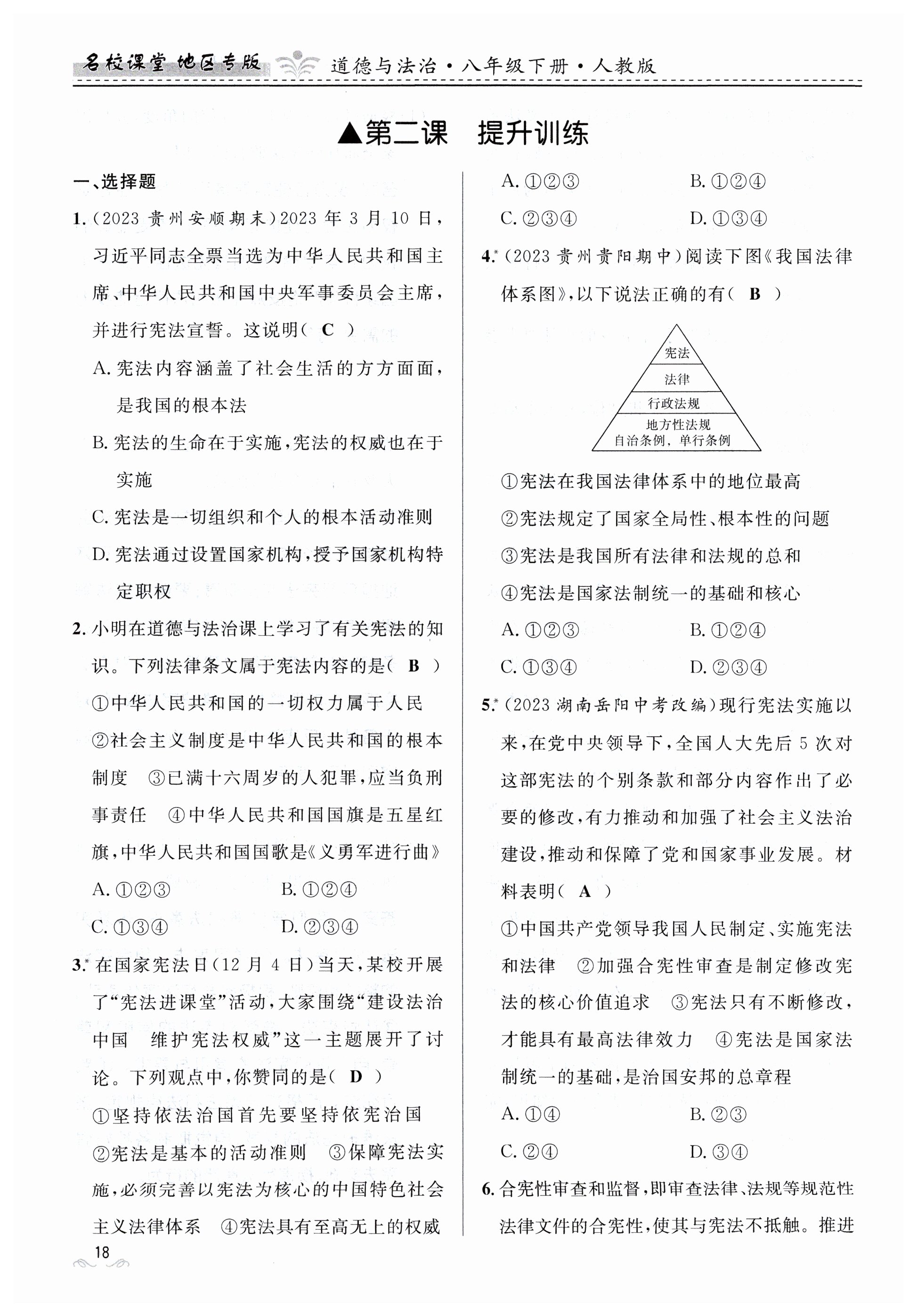 注:目前有些书本章节名称可能整理的还不是很完善,但都是按照顺序排列的,请同学们按照顺序仔细查找。练习册 2024年名校课堂贵州人民出版社八年级道德与法治下册人教版 答案主要是用来给同学们做完题方便对答案用的,请勿直接抄袭。
