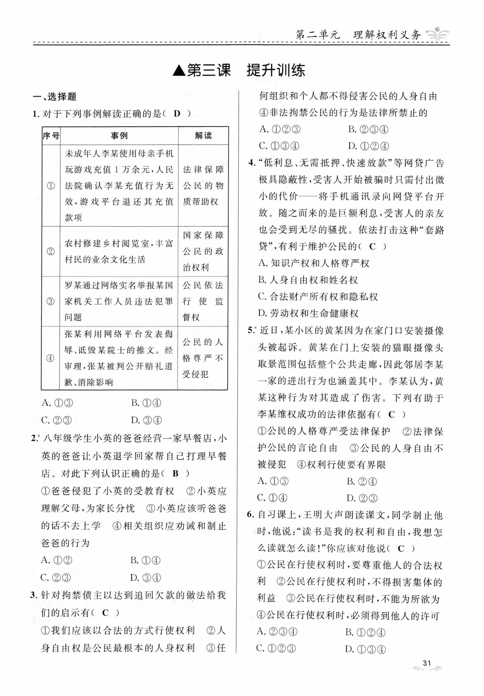 注:目前有些书本章节名称可能整理的还不是很完善,但都是按照顺序排列的,请同学们按照顺序仔细查找。练习册 2024年名校课堂贵州人民出版社八年级道德与法治下册人教版 答案主要是用来给同学们做完题方便对答案用的,请勿直接抄袭。