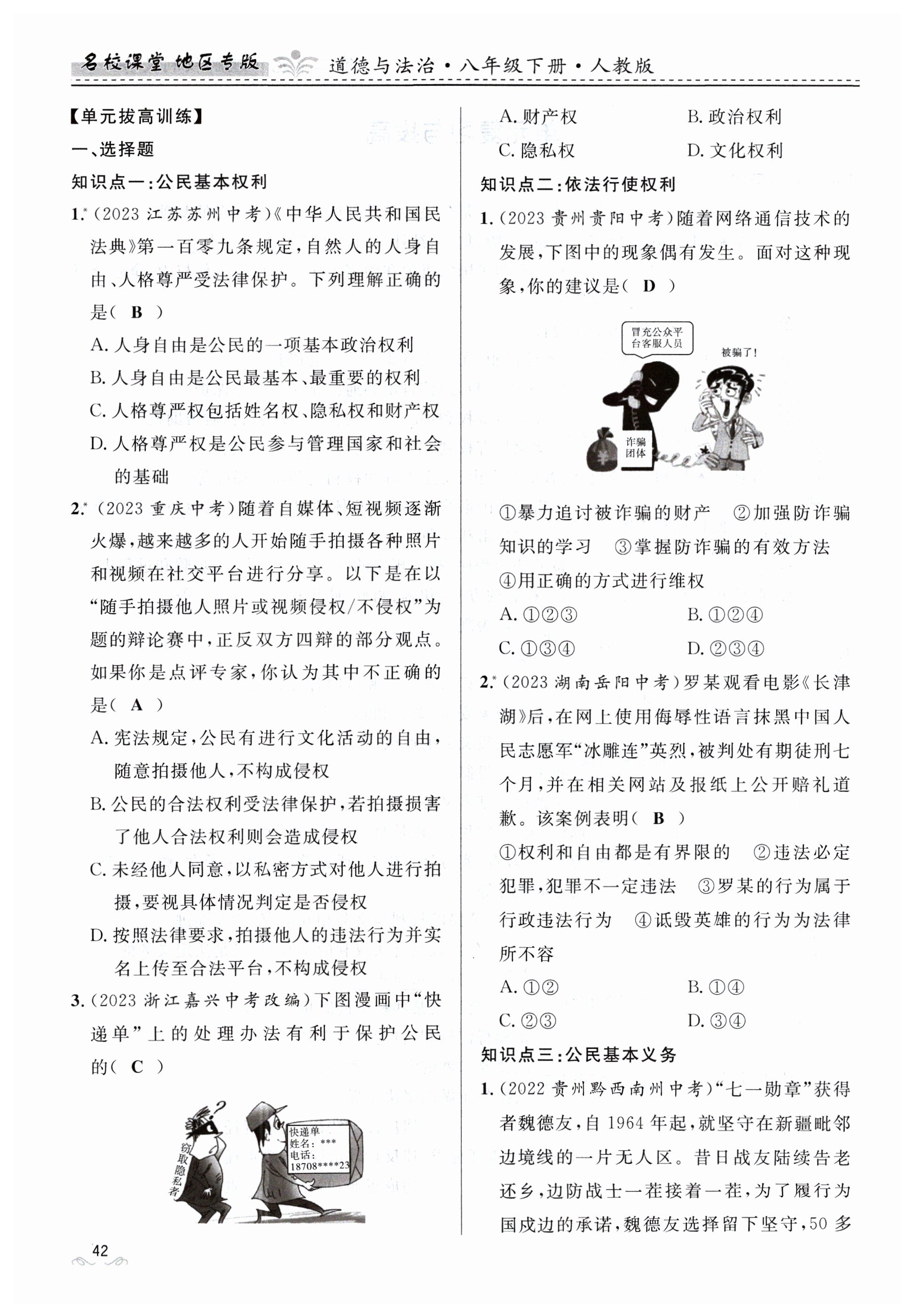 注:目前有些书本章节名称可能整理的还不是很完善,但都是按照顺序排列的,请同学们按照顺序仔细查找。练习册 2024年名校课堂贵州人民出版社八年级道德与法治下册人教版 答案主要是用来给同学们做完题方便对答案用的,请勿直接抄袭。