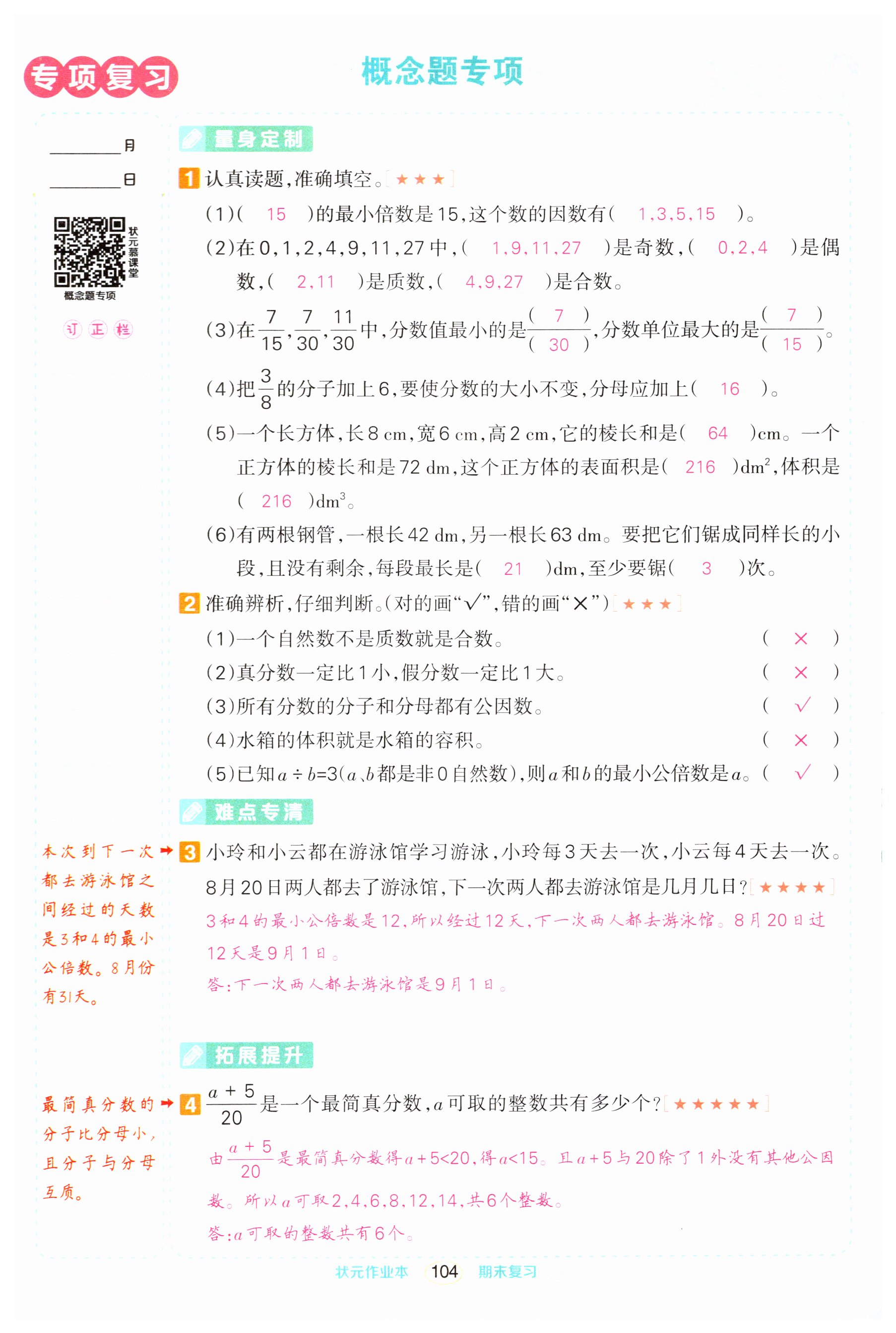 注:目前有些书本章节名称可能整理的还不是很完善,但都是按照顺序排列的,请同学们按照顺序仔细查找。练习册 2024年黄冈状元成才路状元作业本五年级数学下册人教版浙江专版 答案主要是用来给同学们做完题方便对答案用的,请勿直接抄袭。