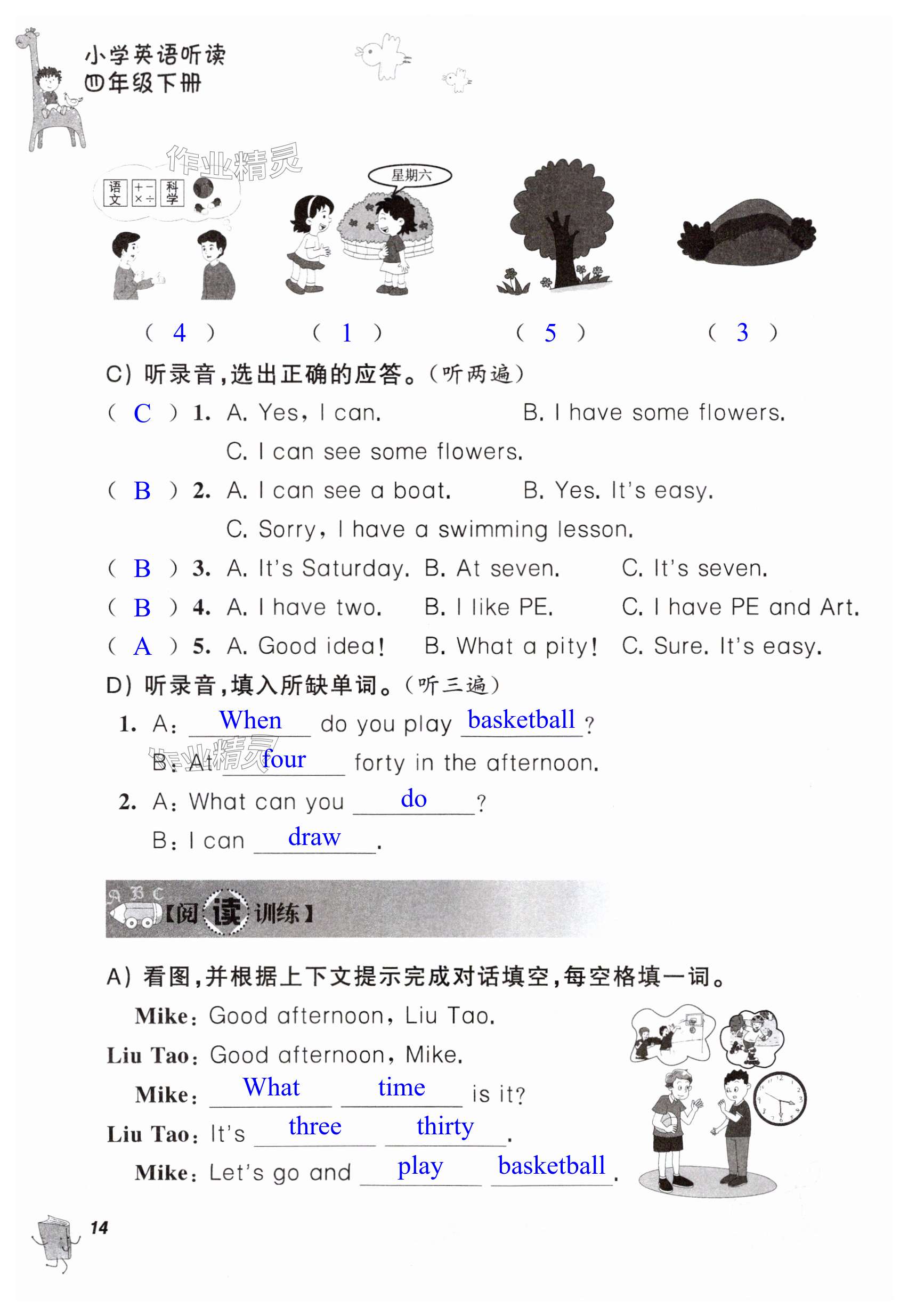 注:目前有些书本章节名称可能整理的还不是很完善,但都是按照顺序排列的,请同学们按照顺序仔细查找。练习册 2024年听读教室小学英语听读四年级下册译林版 答案主要是用来给同学们做完题方便对答案用的,请勿直接抄袭。