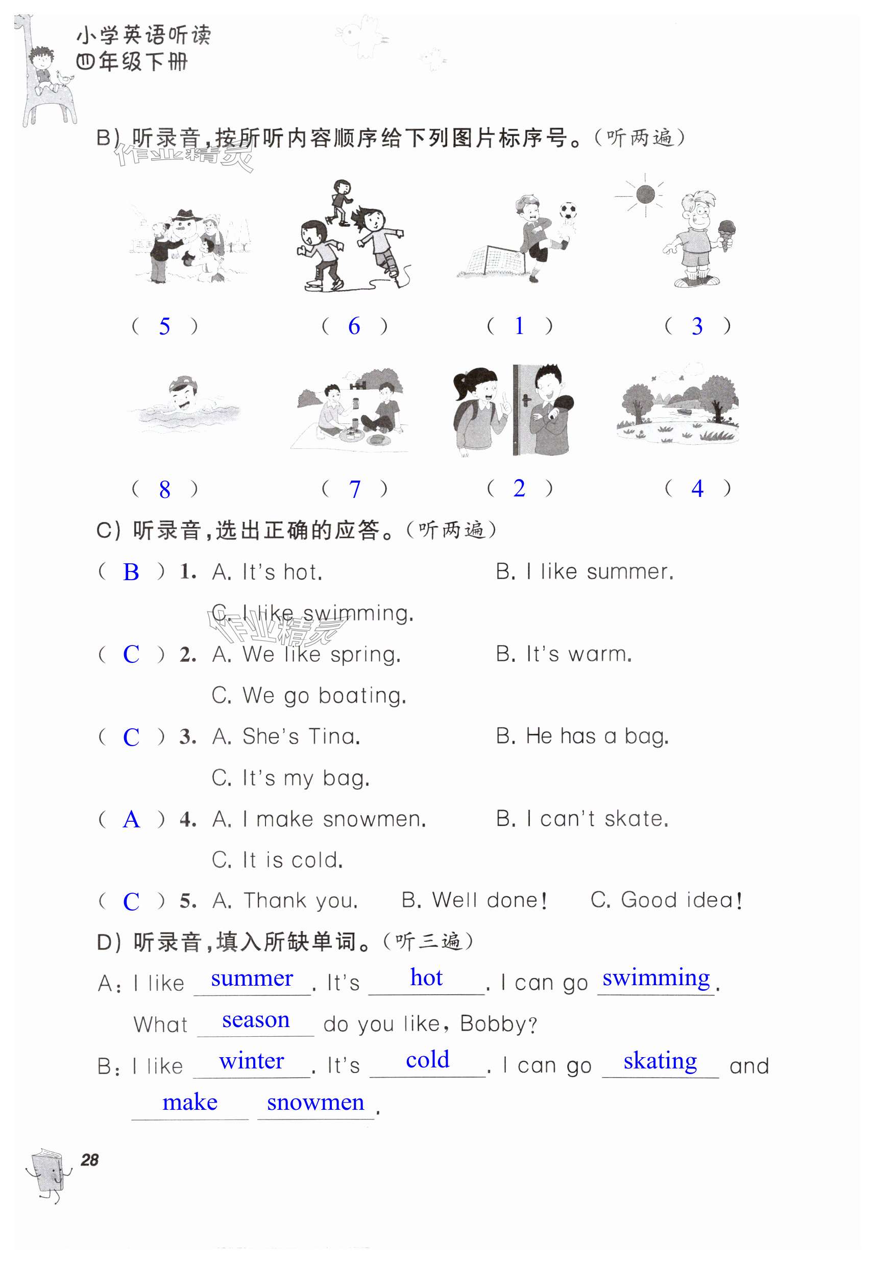 注:目前有些书本章节名称可能整理的还不是很完善,但都是按照顺序排列的,请同学们按照顺序仔细查找。练习册 2024年听读教室小学英语听读四年级下册译林版 答案主要是用来给同学们做完题方便对答案用的,请勿直接抄袭。