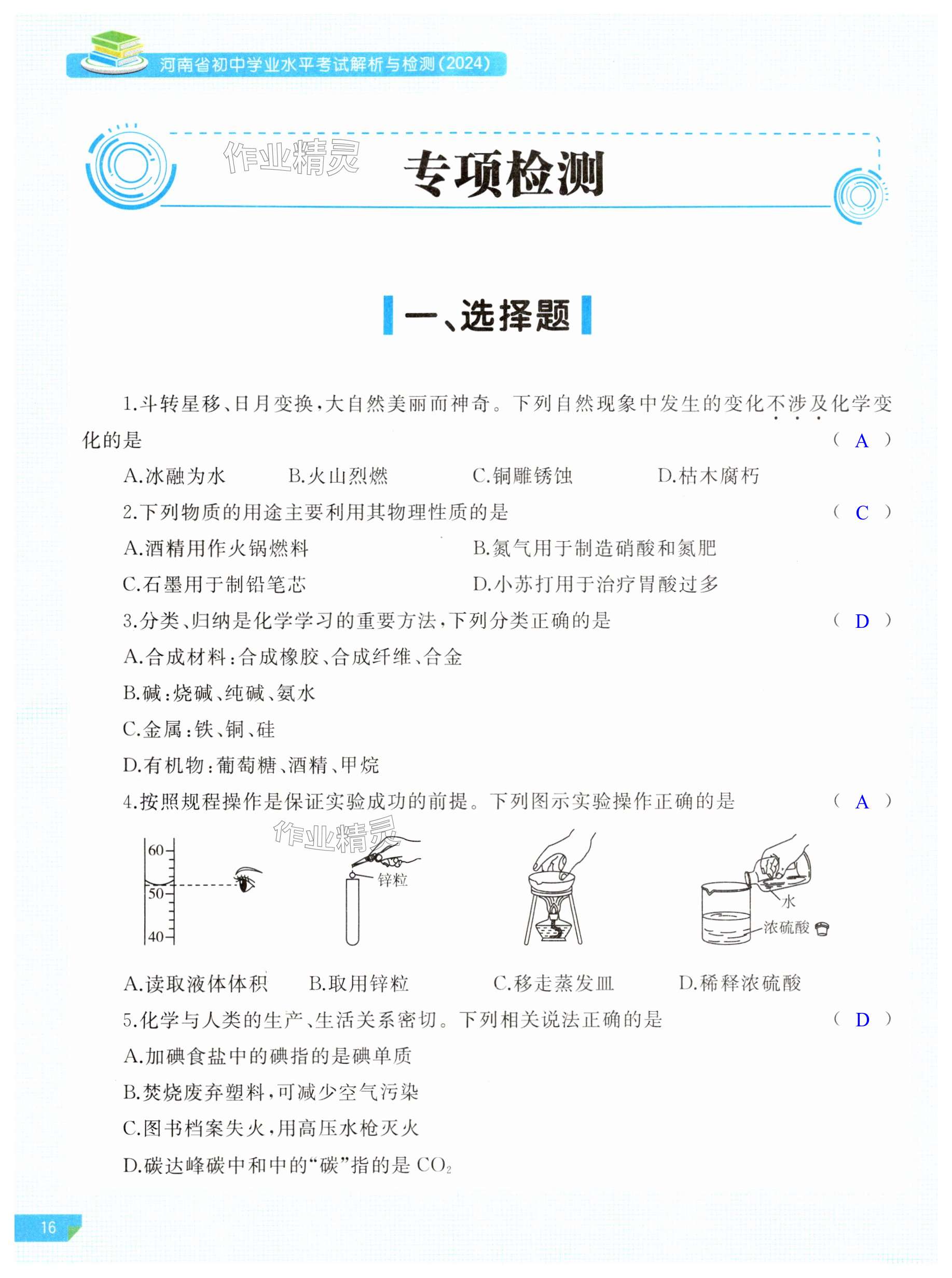 注:目前有些书本章节名称可能整理的还不是很完善,但都是按照顺序排列的,请同学们按照顺序仔细查找。练习册 2024年河南省初中学业水平考试解析与检测化学下册 答案主要是用来给同学们做完题方便对答案用的,请勿直接抄袭。