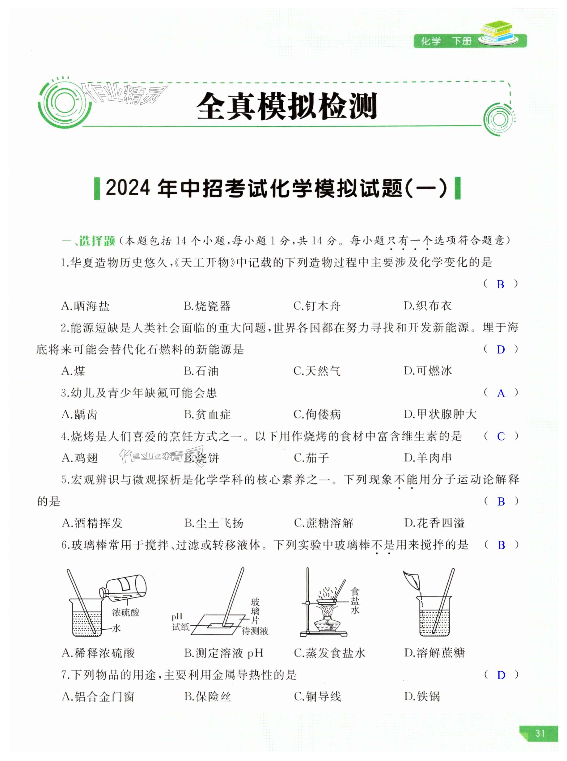 注:目前有些书本章节名称可能整理的还不是很完善,但都是按照顺序排列的,请同学们按照顺序仔细查找。练习册 2024年河南省初中学业水平考试解析与检测化学下册 答案主要是用来给同学们做完题方便对答案用的,请勿直接抄袭。