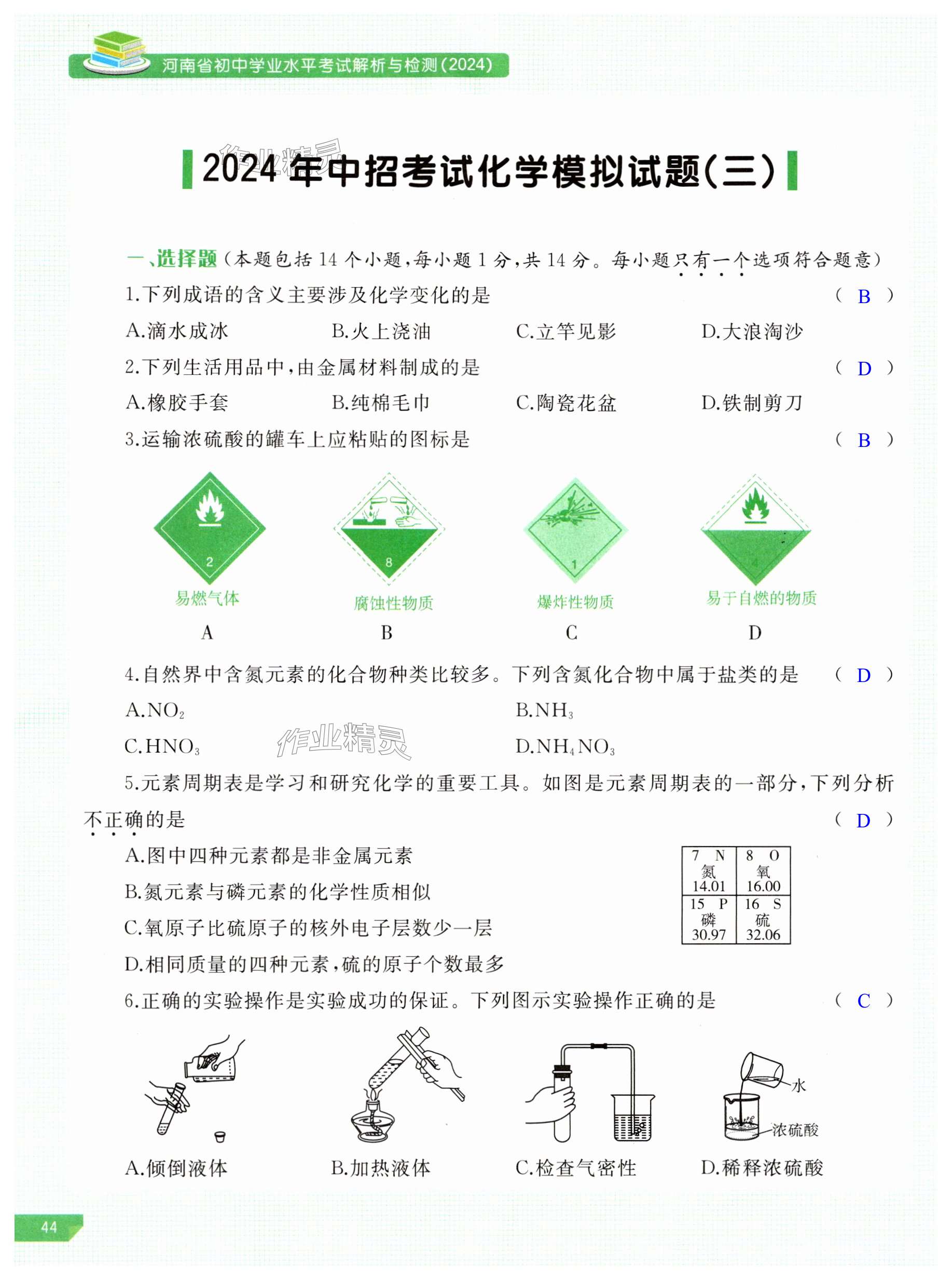 注:目前有些书本章节名称可能整理的还不是很完善,但都是按照顺序排列的,请同学们按照顺序仔细查找。练习册 2024年河南省初中学业水平考试解析与检测化学下册 答案主要是用来给同学们做完题方便对答案用的,请勿直接抄袭。