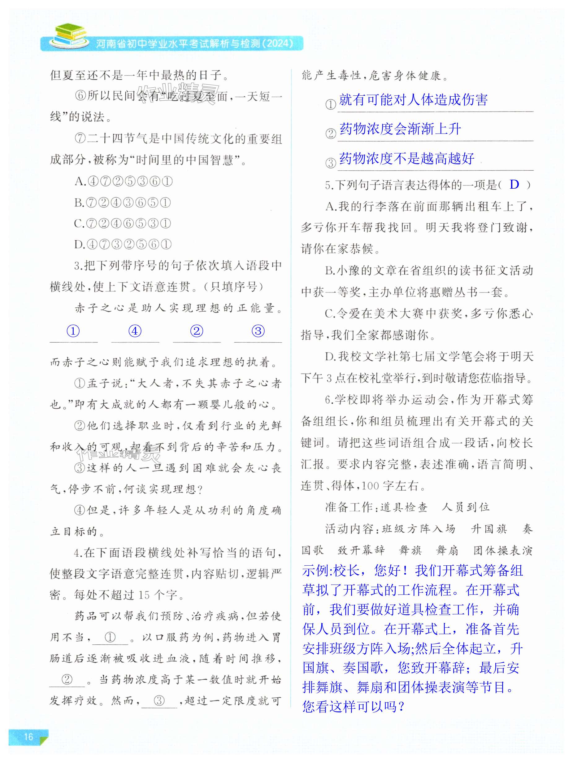 注:目前有些书本章节名称可能整理的还不是很完善,但都是按照顺序排列的,请同学们按照顺序仔细查找。练习册 2024年河南省初中学业水平考试解析与检测语文下册 答案主要是用来给同学们做完题方便对答案用的,请勿直接抄袭。