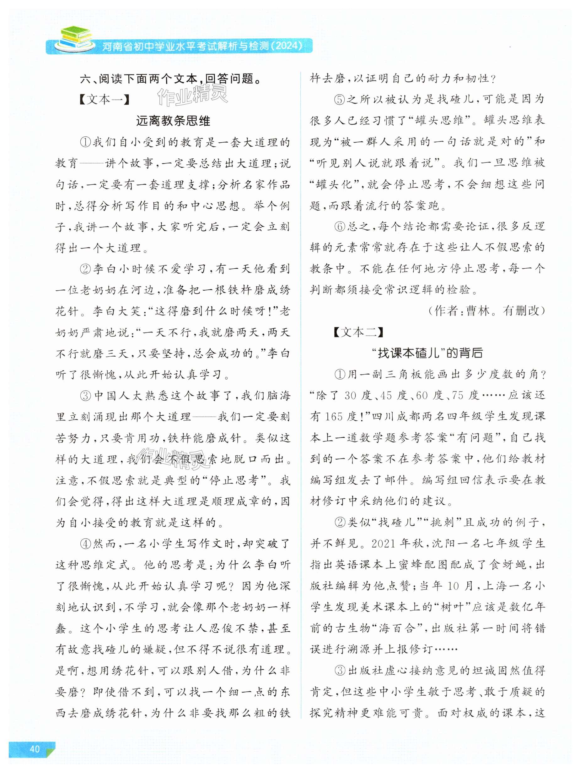 注:目前有些书本章节名称可能整理的还不是很完善,但都是按照顺序排列的,请同学们按照顺序仔细查找。练习册 2024年河南省初中学业水平考试解析与检测语文下册 答案主要是用来给同学们做完题方便对答案用的,请勿直接抄袭。