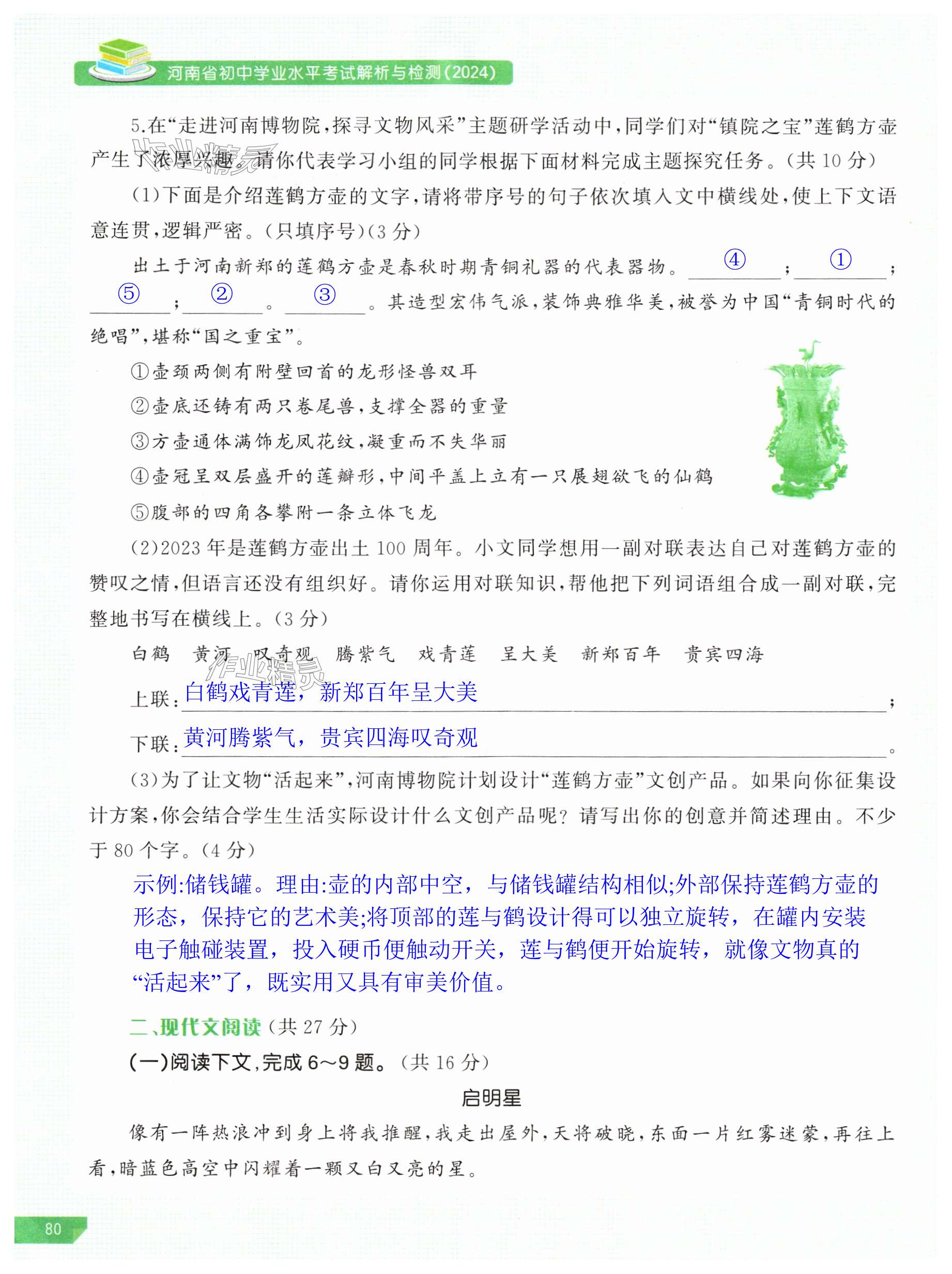 注:目前有些书本章节名称可能整理的还不是很完善,但都是按照顺序排列的,请同学们按照顺序仔细查找。练习册 2024年河南省初中学业水平考试解析与检测语文下册 答案主要是用来给同学们做完题方便对答案用的,请勿直接抄袭。