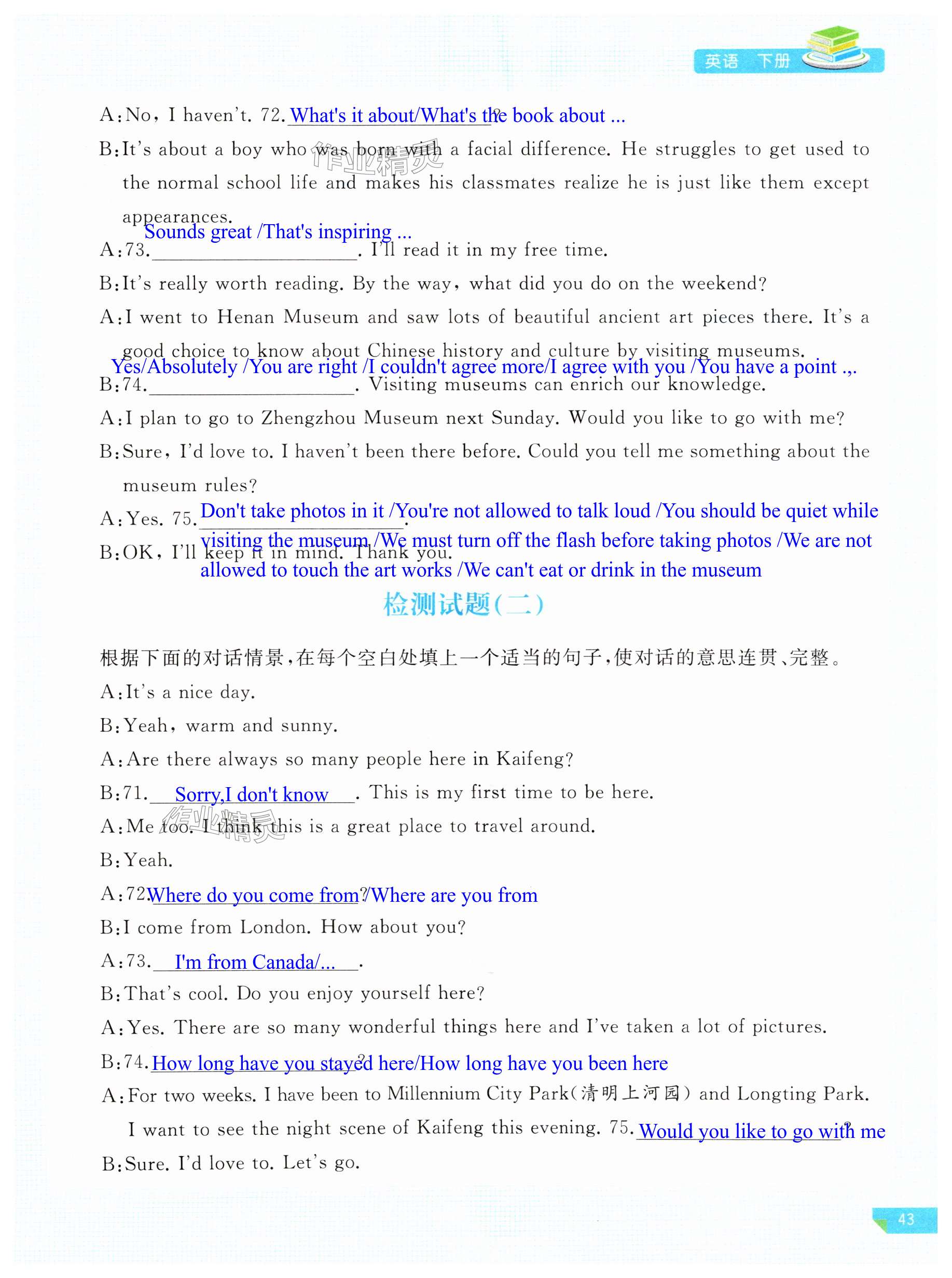 注:目前有些书本章节名称可能整理的还不是很完善,但都是按照顺序排列的,请同学们按照顺序仔细查找。练习册 2024年河南省初中学业水平考试解析与检测英语下册 答案主要是用来给同学们做完题方便对答案用的,请勿直接抄袭。