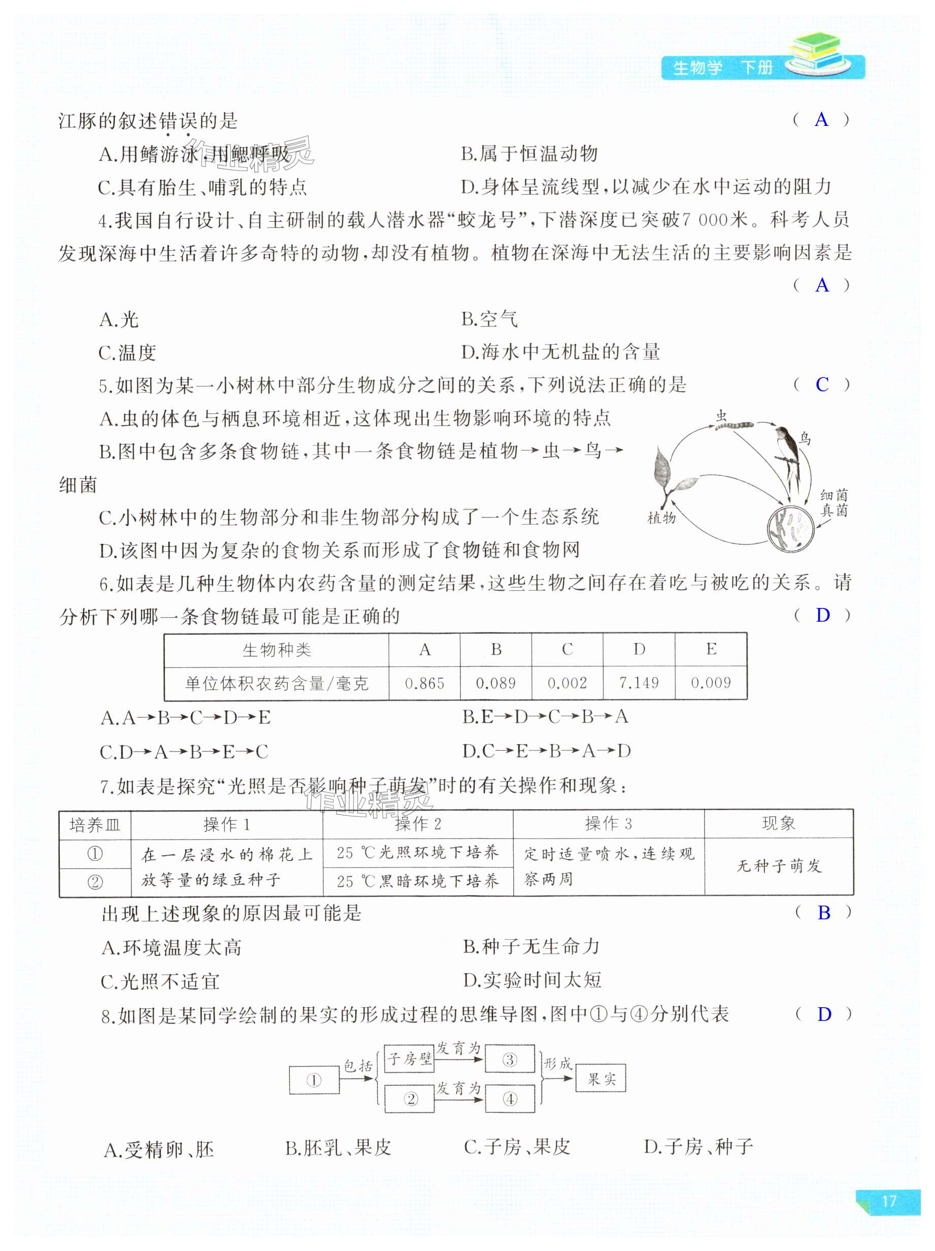 注:目前有些书本章节名称可能整理的还不是很完善,但都是按照顺序排列的,请同学们按照顺序仔细查找。练习册 2024年河南省初中学业水平考试解析与检测生物下册 答案主要是用来给同学们做完题方便对答案用的,请勿直接抄袭。