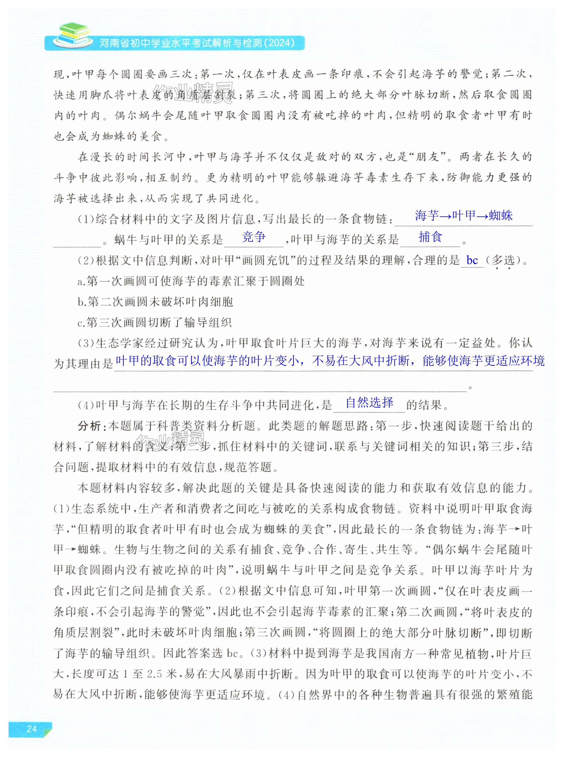 注:目前有些书本章节名称可能整理的还不是很完善,但都是按照顺序排列的,请同学们按照顺序仔细查找。练习册 2024年河南省初中学业水平考试解析与检测生物下册 答案主要是用来给同学们做完题方便对答案用的,请勿直接抄袭。