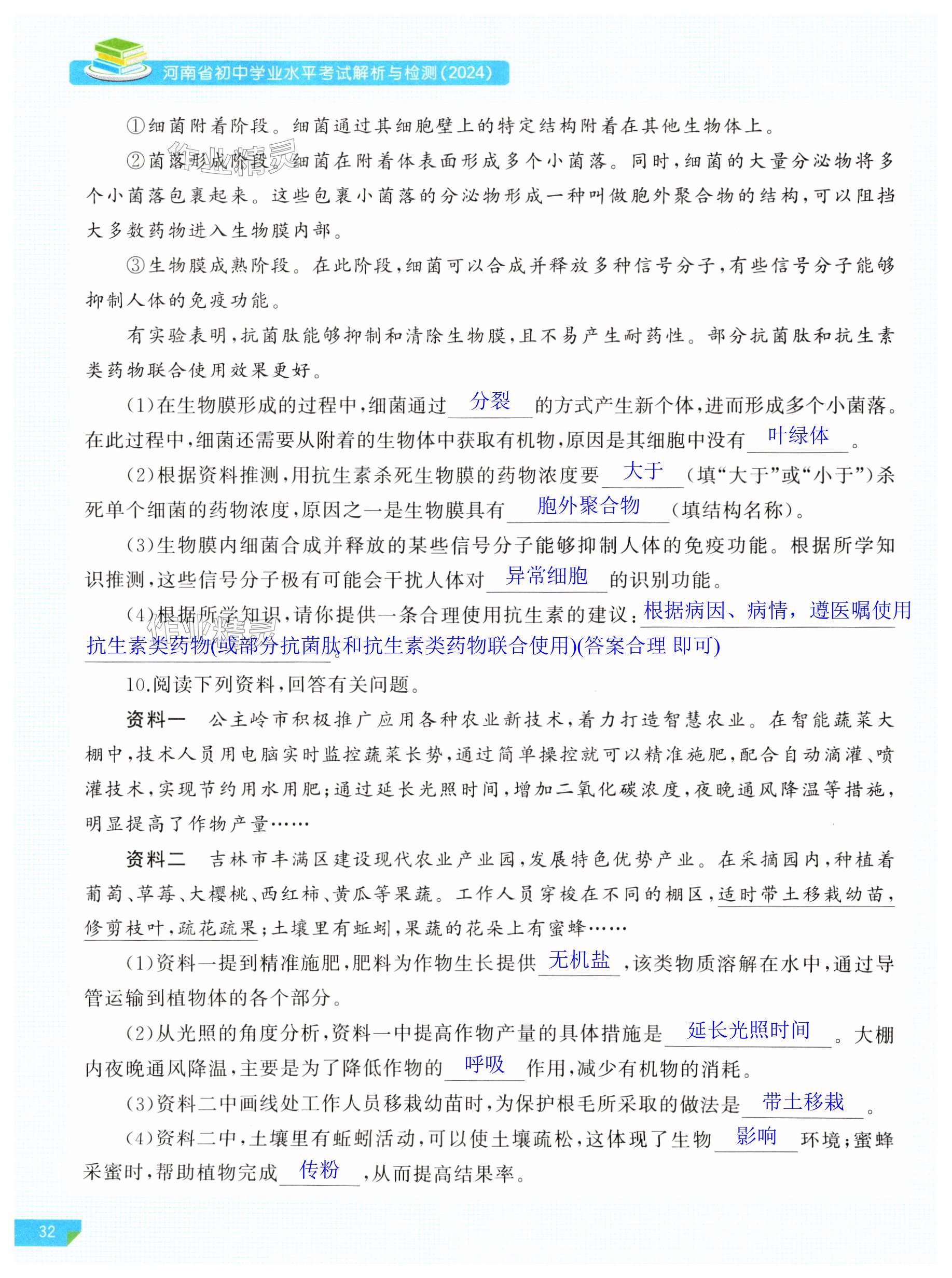 注:目前有些书本章节名称可能整理的还不是很完善,但都是按照顺序排列的,请同学们按照顺序仔细查找。练习册 2024年河南省初中学业水平考试解析与检测生物下册 答案主要是用来给同学们做完题方便对答案用的,请勿直接抄袭。