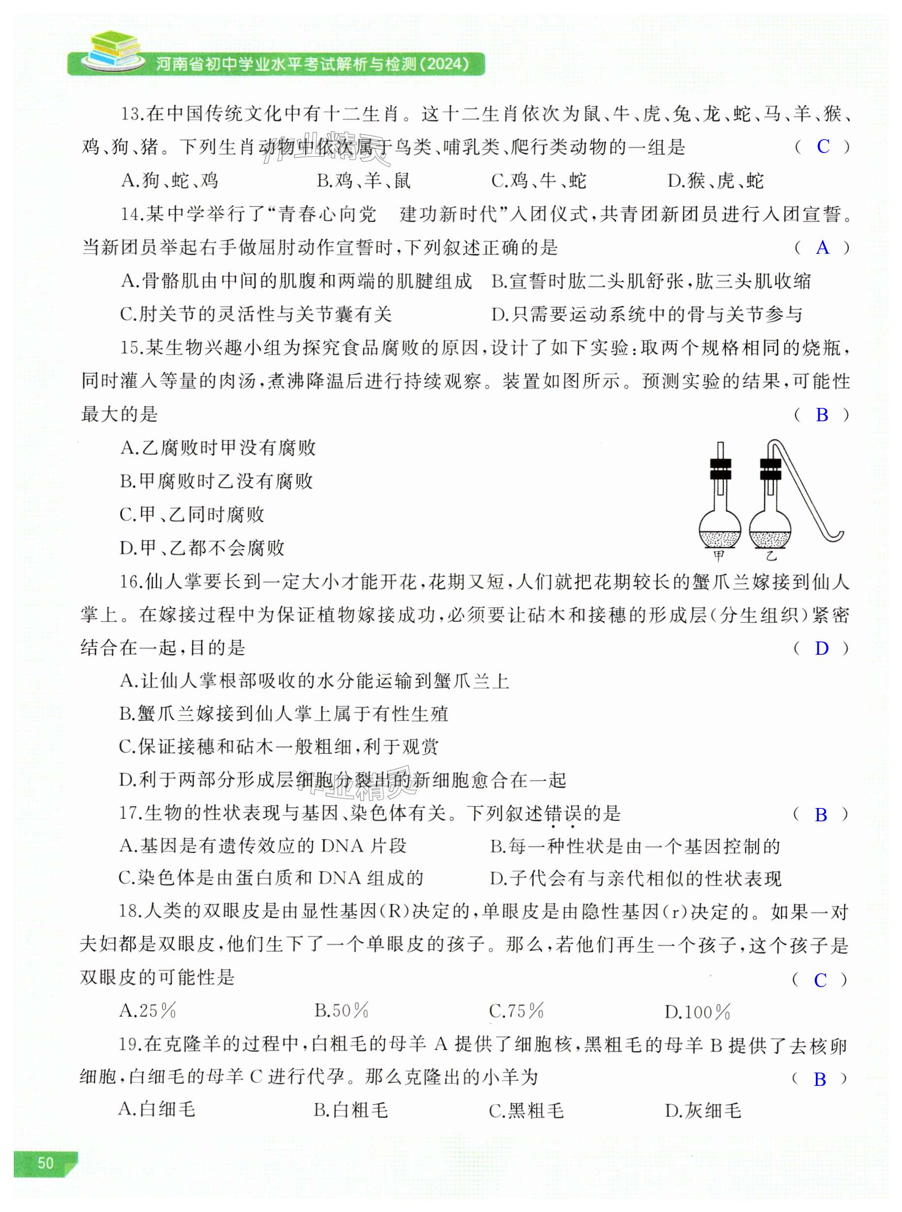 注:目前有些书本章节名称可能整理的还不是很完善,但都是按照顺序排列的,请同学们按照顺序仔细查找。练习册 2024年河南省初中学业水平考试解析与检测生物下册 答案主要是用来给同学们做完题方便对答案用的,请勿直接抄袭。