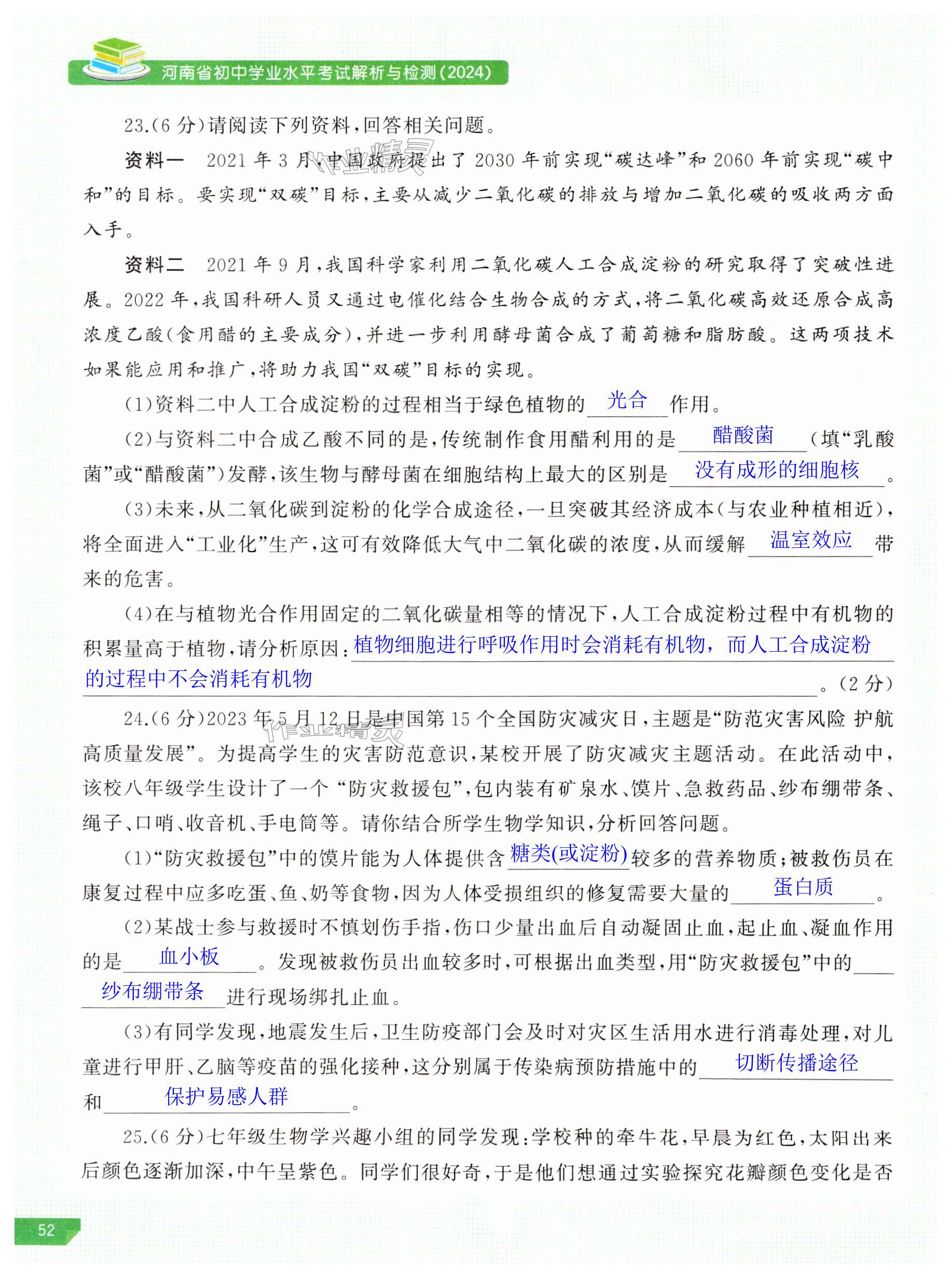 注:目前有些书本章节名称可能整理的还不是很完善,但都是按照顺序排列的,请同学们按照顺序仔细查找。练习册 2024年河南省初中学业水平考试解析与检测生物下册 答案主要是用来给同学们做完题方便对答案用的,请勿直接抄袭。