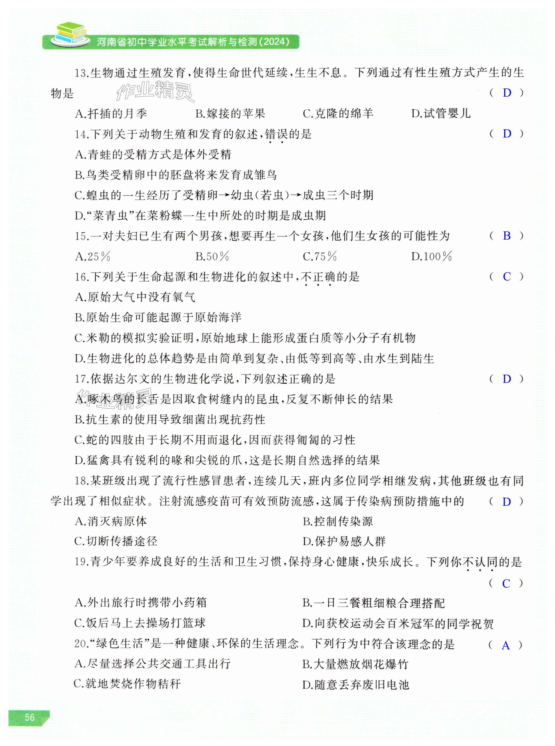注:目前有些书本章节名称可能整理的还不是很完善,但都是按照顺序排列的,请同学们按照顺序仔细查找。练习册 2024年河南省初中学业水平考试解析与检测生物下册 答案主要是用来给同学们做完题方便对答案用的,请勿直接抄袭。