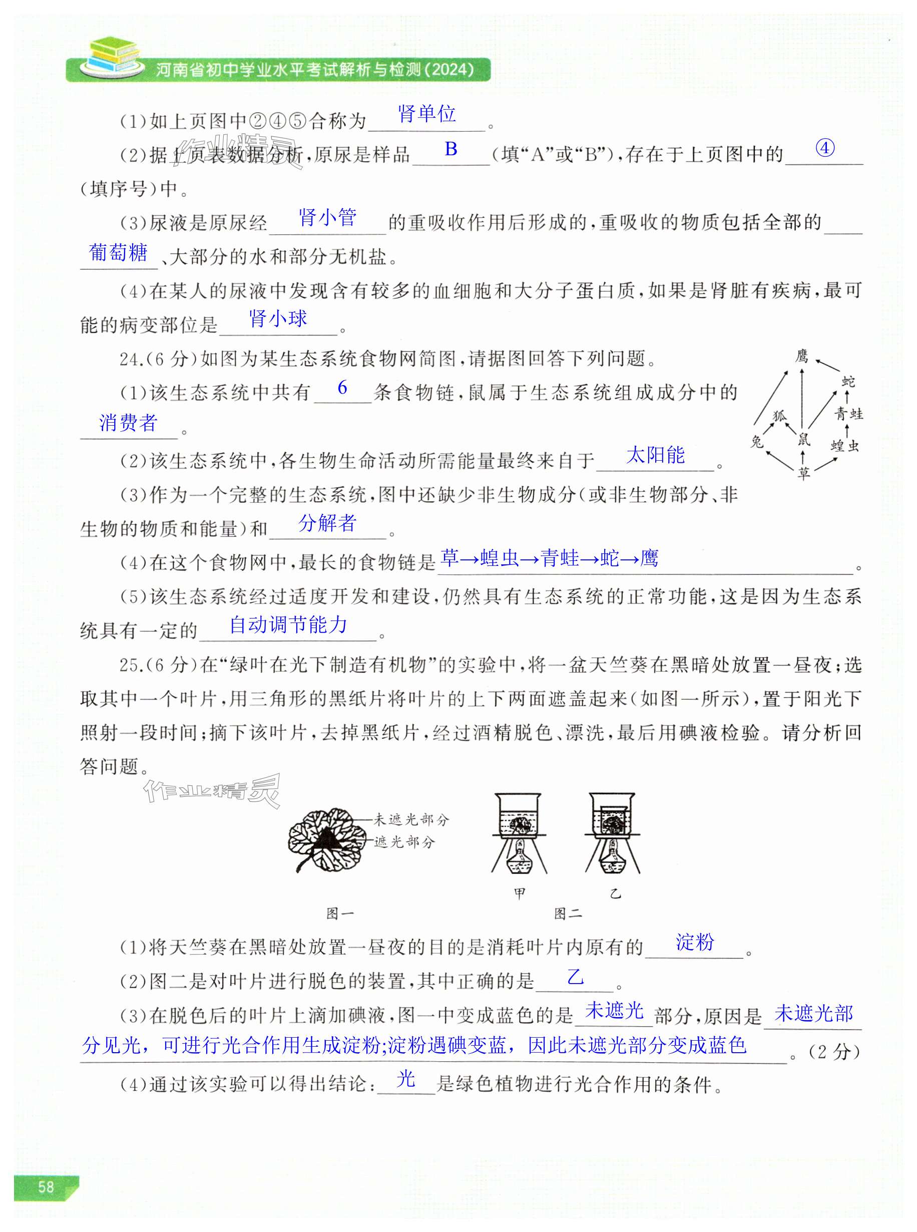 注:目前有些书本章节名称可能整理的还不是很完善,但都是按照顺序排列的,请同学们按照顺序仔细查找。练习册 2024年河南省初中学业水平考试解析与检测生物下册 答案主要是用来给同学们做完题方便对答案用的,请勿直接抄袭。