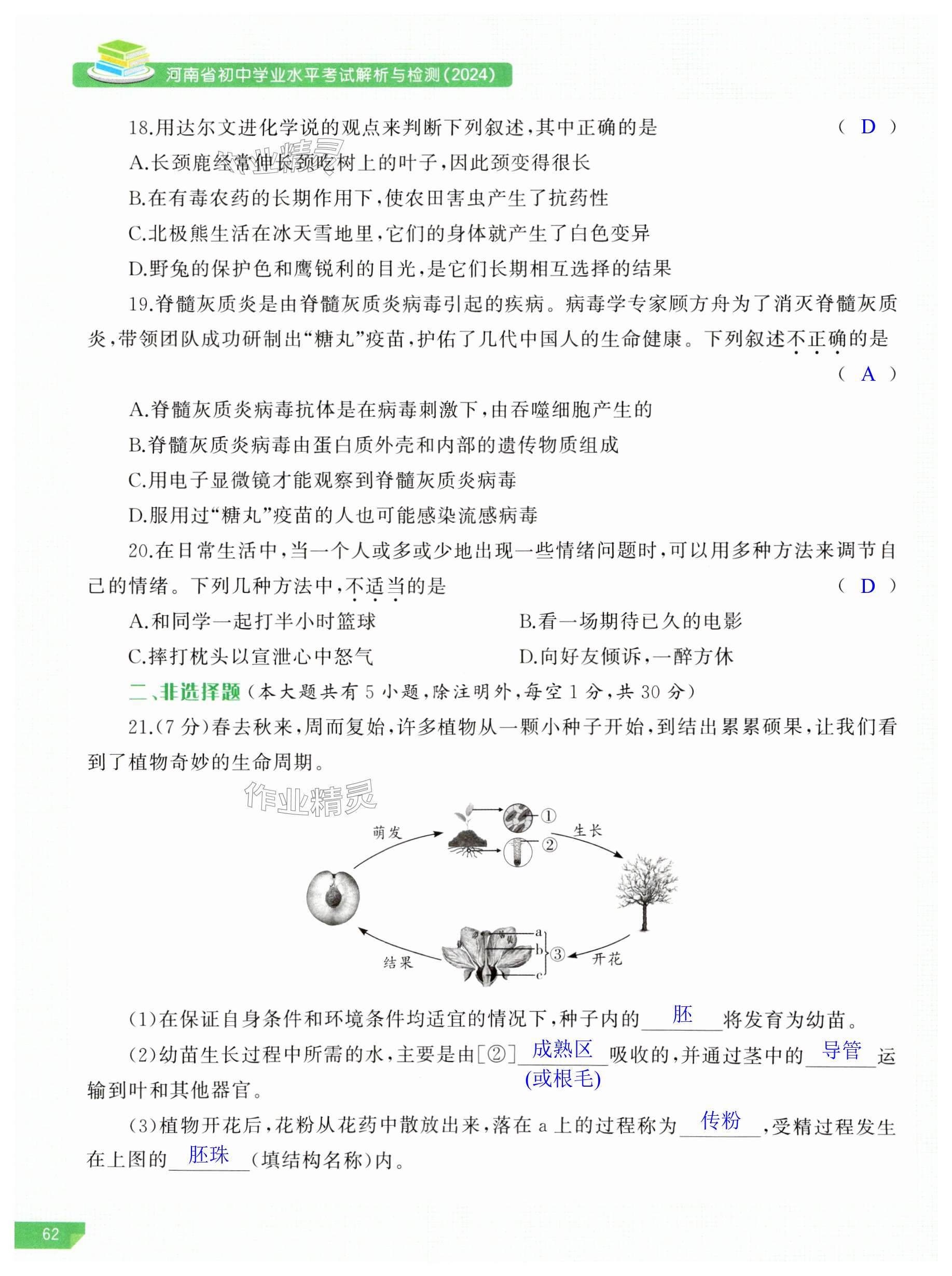 注:目前有些书本章节名称可能整理的还不是很完善,但都是按照顺序排列的,请同学们按照顺序仔细查找。练习册 2024年河南省初中学业水平考试解析与检测生物下册 答案主要是用来给同学们做完题方便对答案用的,请勿直接抄袭。