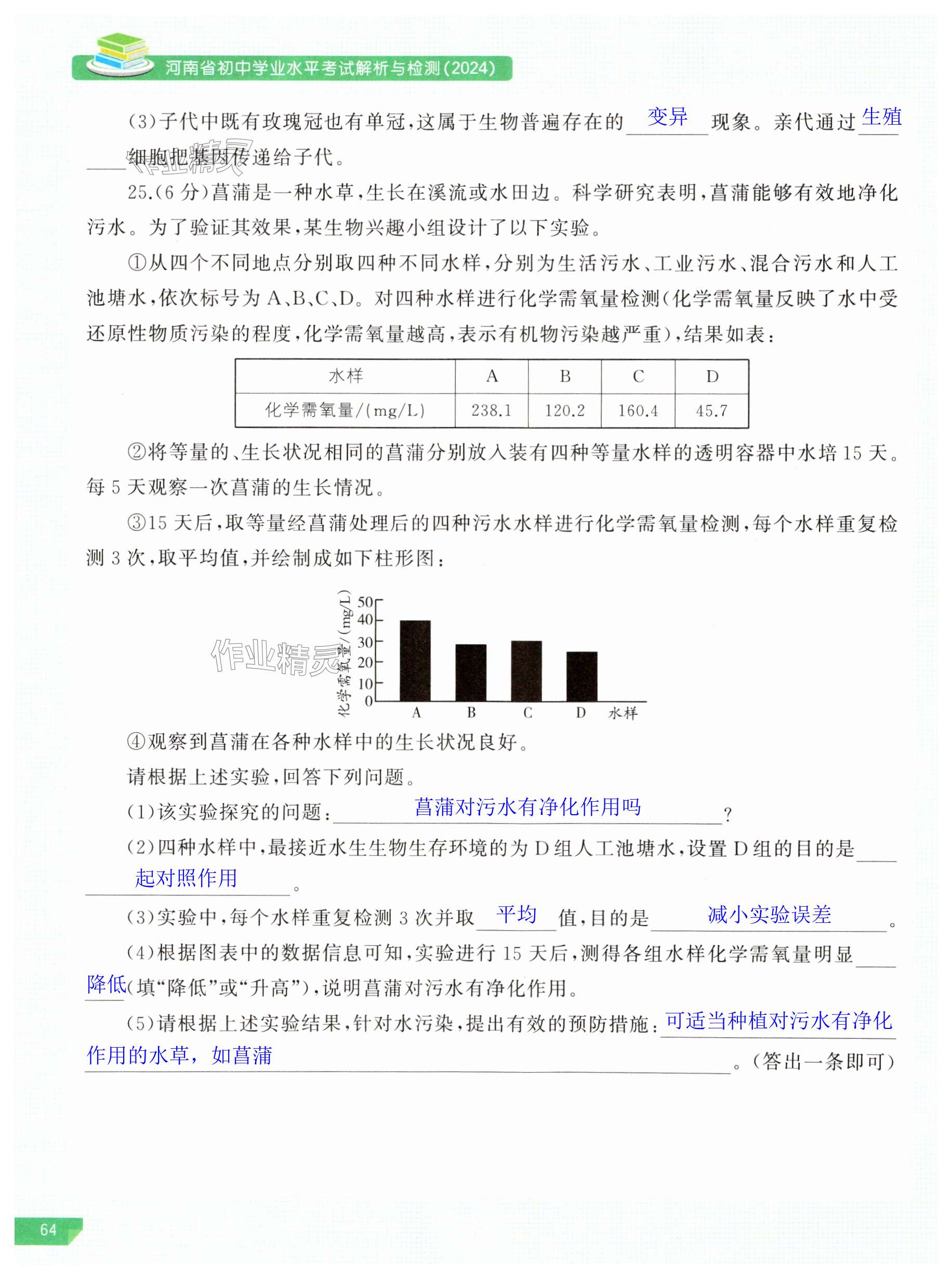 注:目前有些书本章节名称可能整理的还不是很完善,但都是按照顺序排列的,请同学们按照顺序仔细查找。练习册 2024年河南省初中学业水平考试解析与检测生物下册 答案主要是用来给同学们做完题方便对答案用的,请勿直接抄袭。