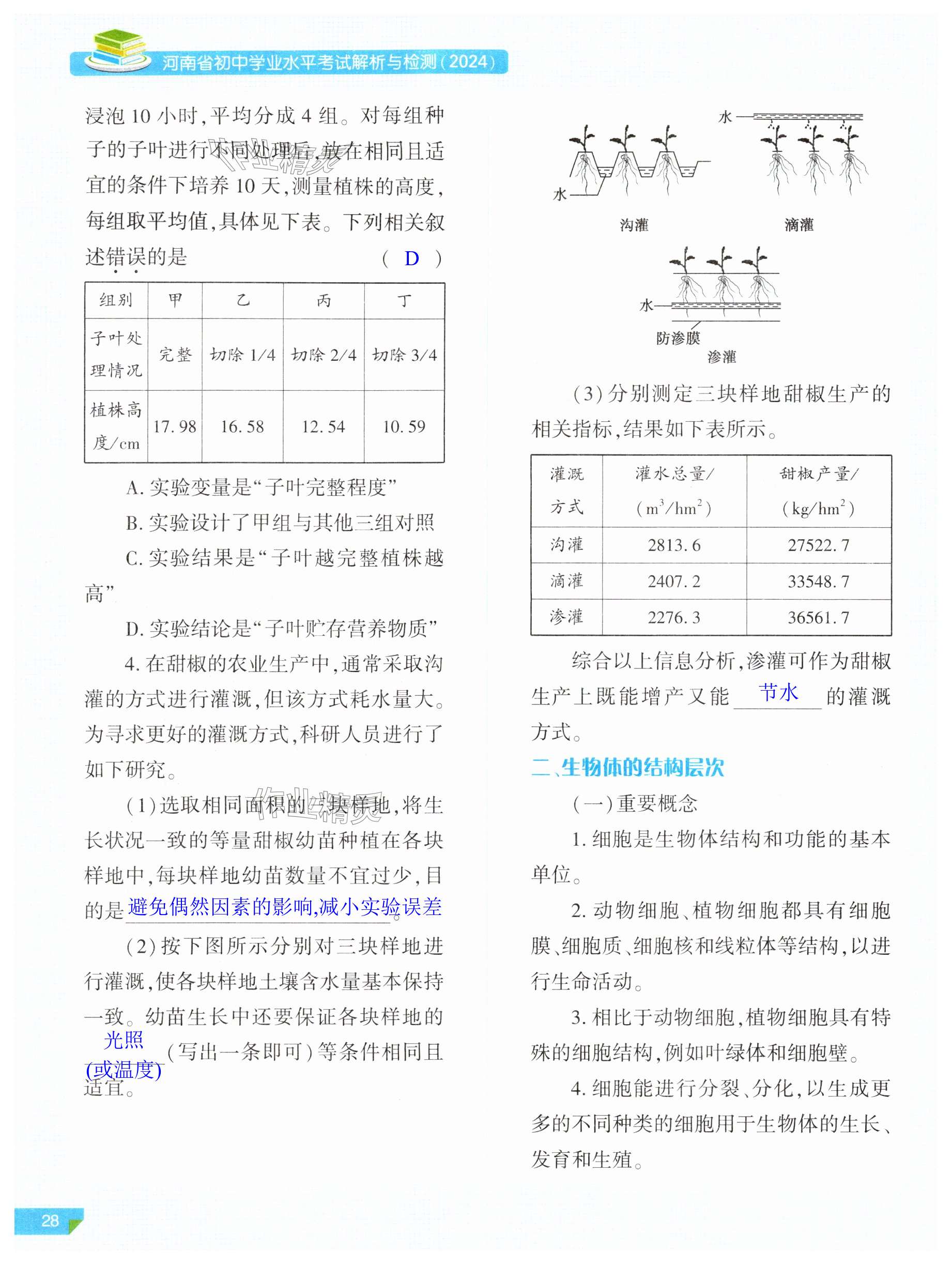 注:目前有些书本章节名称可能整理的还不是很完善,但都是按照顺序排列的,请同学们按照顺序仔细查找。练习册 2024年河南省初中学业水平考试解析与检测生物上册 答案主要是用来给同学们做完题方便对答案用的,请勿直接抄袭。