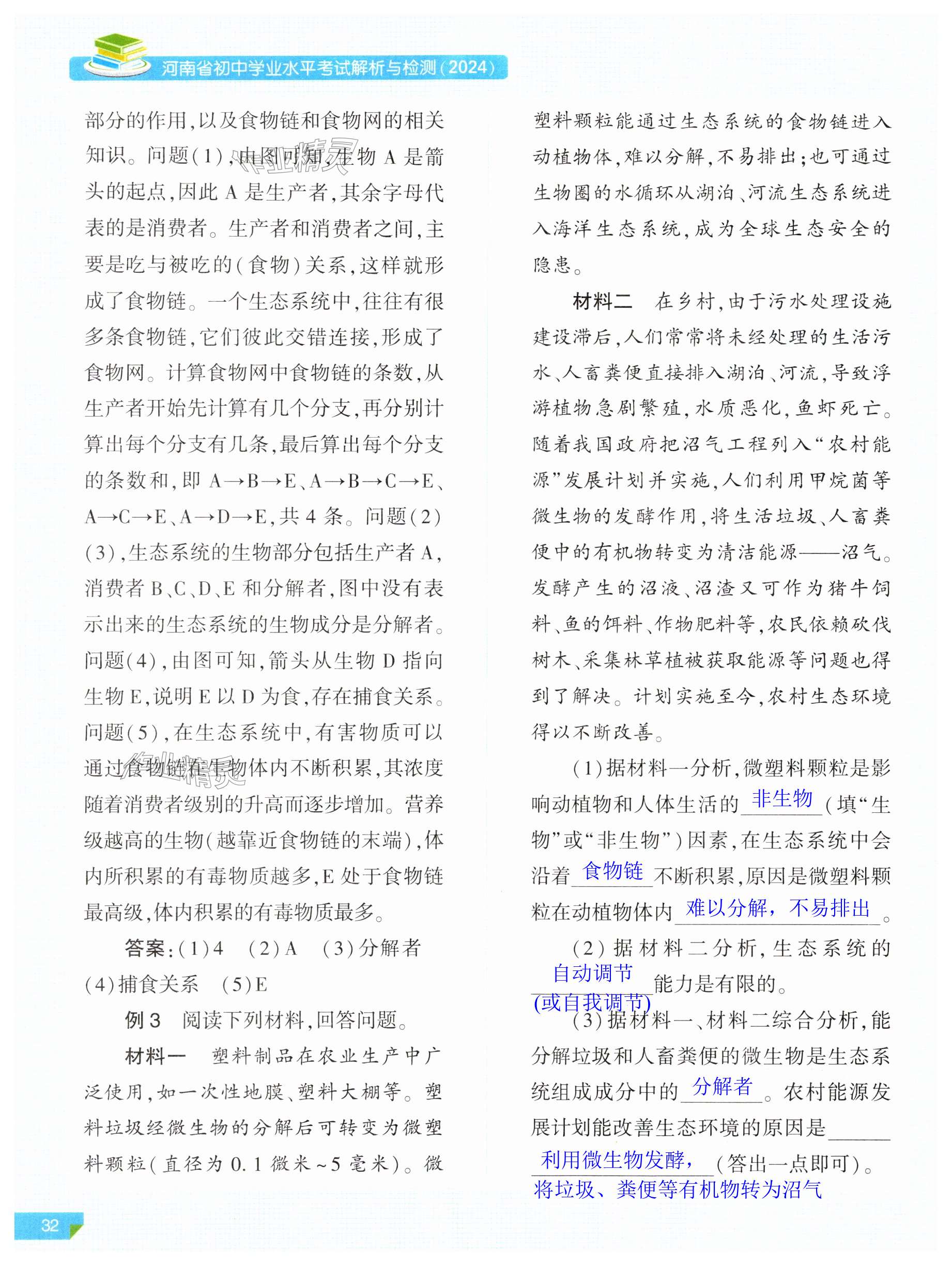注:目前有些书本章节名称可能整理的还不是很完善,但都是按照顺序排列的,请同学们按照顺序仔细查找。练习册 2024年河南省初中学业水平考试解析与检测生物上册 答案主要是用来给同学们做完题方便对答案用的,请勿直接抄袭。