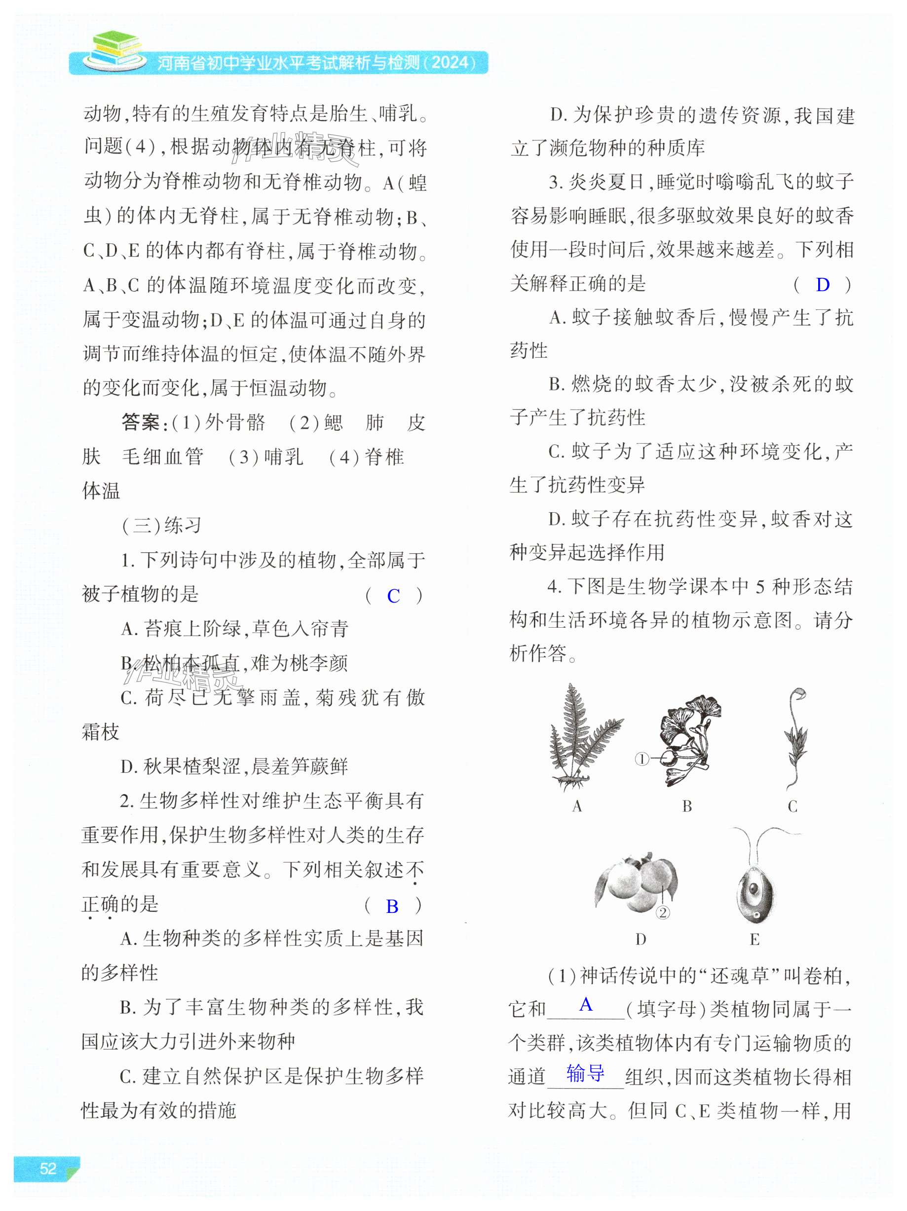 注:目前有些书本章节名称可能整理的还不是很完善,但都是按照顺序排列的,请同学们按照顺序仔细查找。练习册 2024年河南省初中学业水平考试解析与检测生物上册 答案主要是用来给同学们做完题方便对答案用的,请勿直接抄袭。