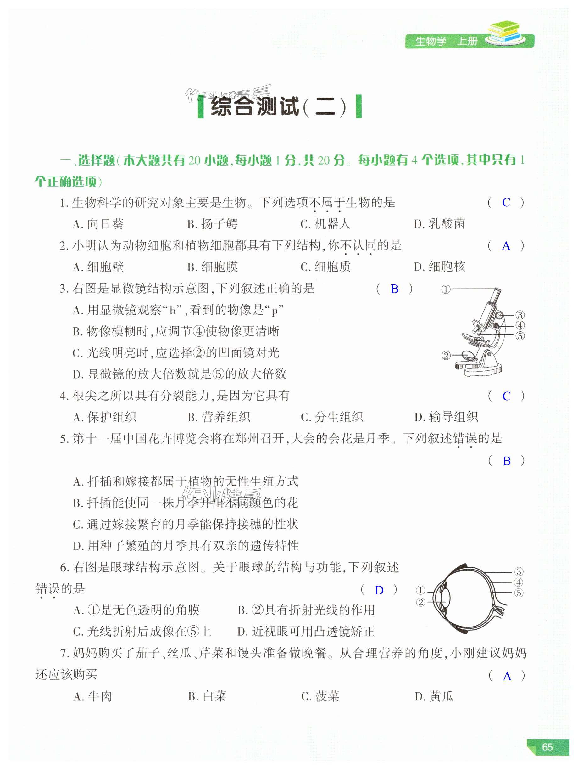 注:目前有些书本章节名称可能整理的还不是很完善,但都是按照顺序排列的,请同学们按照顺序仔细查找。练习册 2024年河南省初中学业水平考试解析与检测生物上册 答案主要是用来给同学们做完题方便对答案用的,请勿直接抄袭。