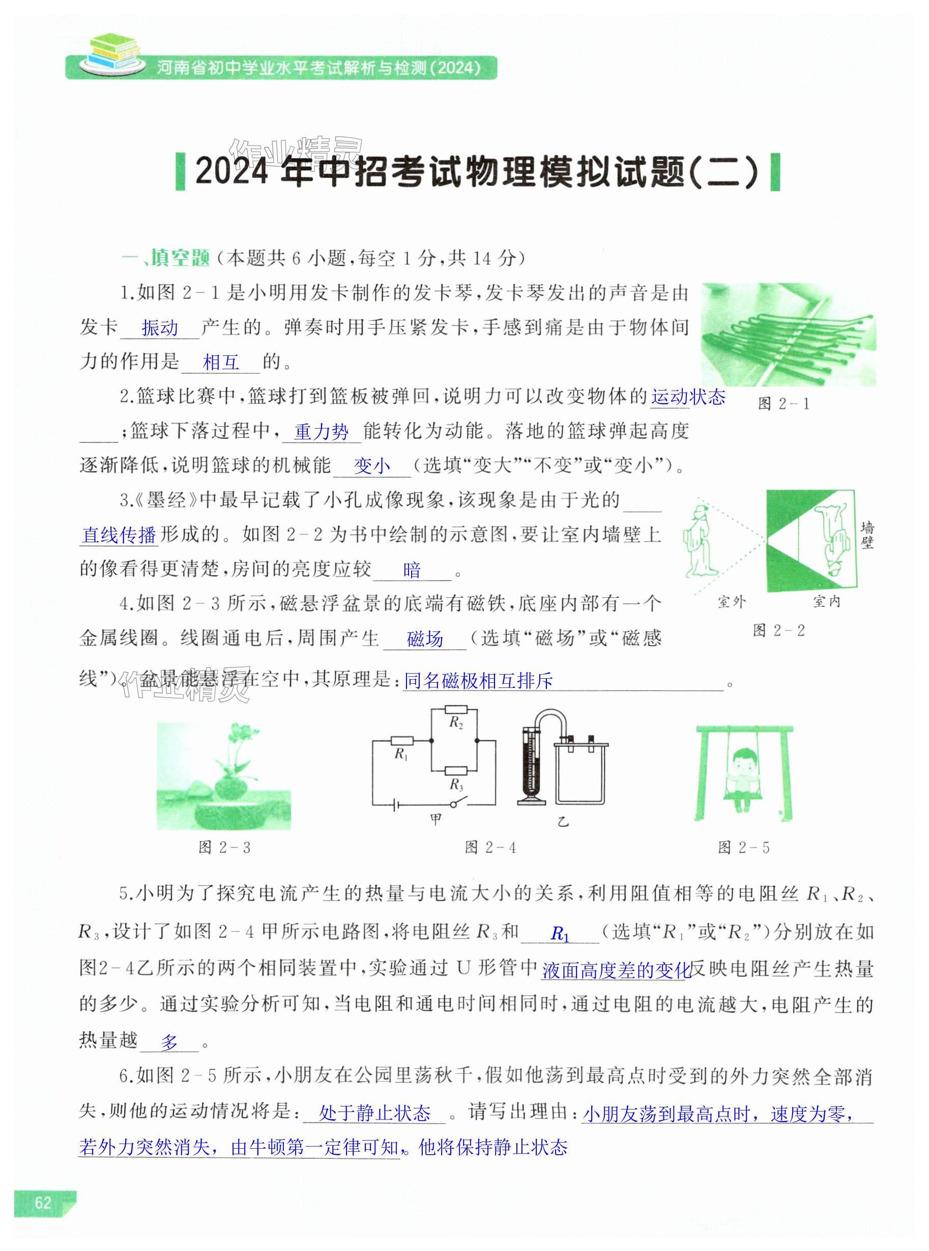 注:目前有些书本章节名称可能整理的还不是很完善,但都是按照顺序排列的,请同学们按照顺序仔细查找。练习册 2024年河南省初中学业水平考试解析与检测物理下册 答案主要是用来给同学们做完题方便对答案用的,请勿直接抄袭。