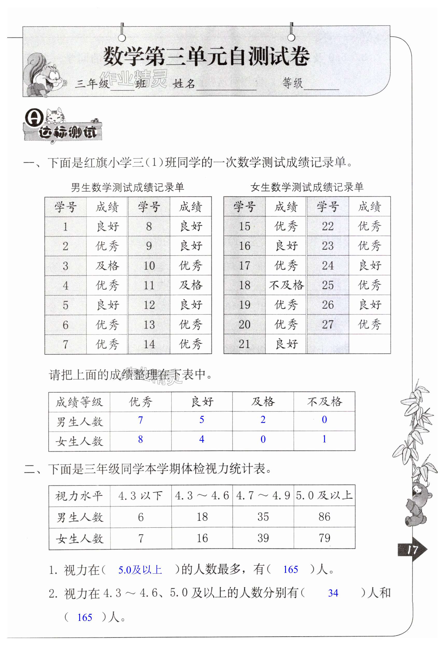 注:目前有些书本章节名称可能整理的还不是很完善,但都是按照顺序排列的,请同学们按照顺序仔细查找。练习册 2024年单元自测三年级数学下册人教版 答案主要是用来给同学们做完题方便对答案用的,请勿直接抄袭。