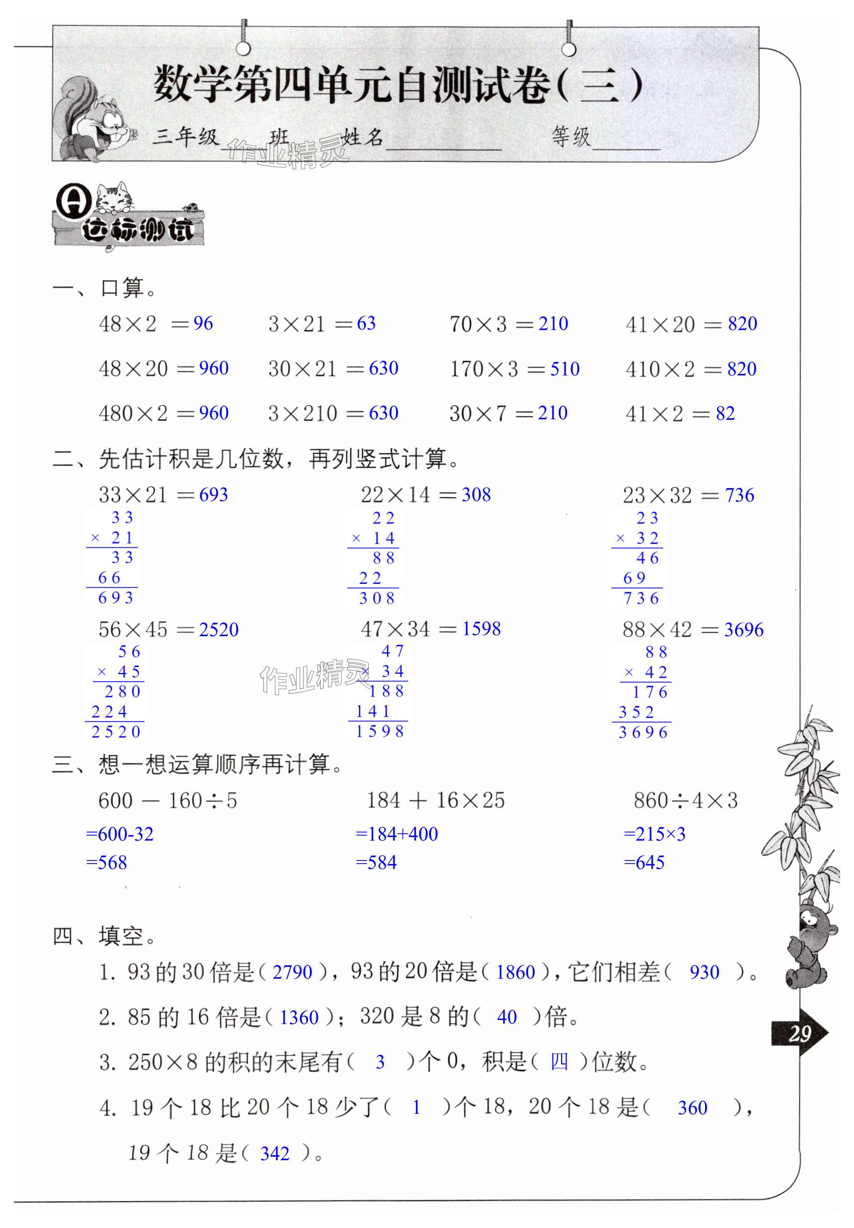 注:目前有些书本章节名称可能整理的还不是很完善,但都是按照顺序排列的,请同学们按照顺序仔细查找。练习册 2024年单元自测三年级数学下册人教版 答案主要是用来给同学们做完题方便对答案用的,请勿直接抄袭。