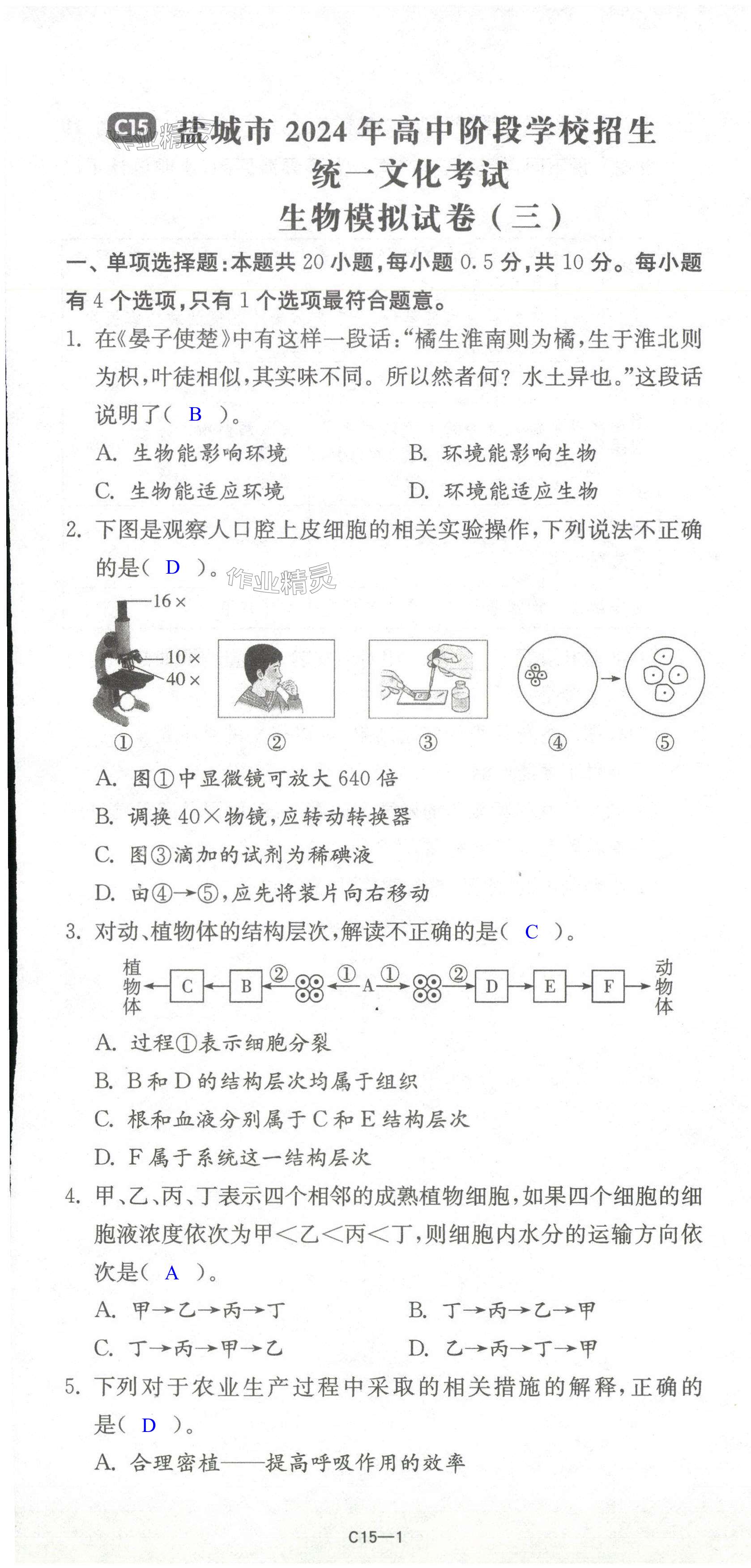 注:目前有些书本章节名称可能整理的还不是很完善,但都是按照顺序排列的,请同学们按照顺序仔细查找。练习册 2024年春雨教育考必胜中考试卷精选生物盐城专版 答案主要是用来给同学们做完题方便对答案用的,请勿直接抄袭。