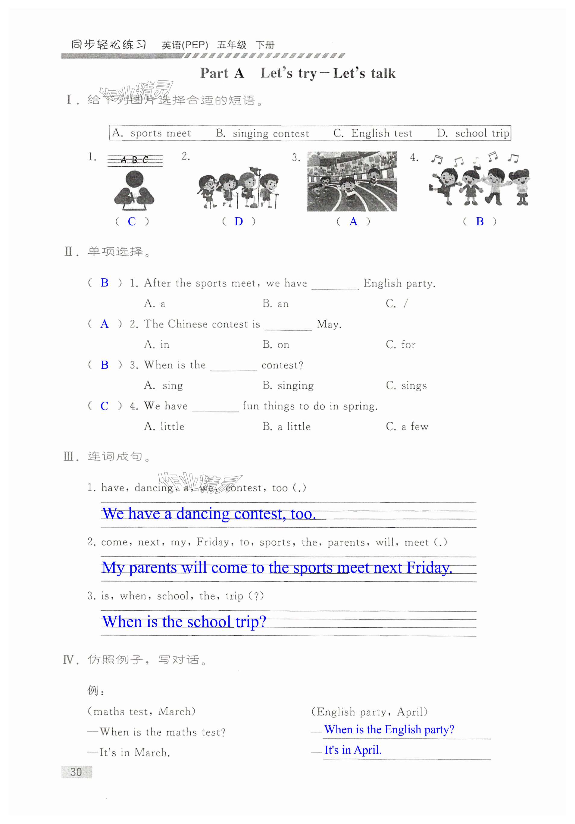 注:目前有些书本章节名称可能整理的还不是很完善,但都是按照顺序排列的,请同学们按照顺序仔细查找。练习册 2024年同步轻松练习五年级英语下册人教版贵州专版 答案主要是用来给同学们做完题方便对答案用的,请勿直接抄袭。