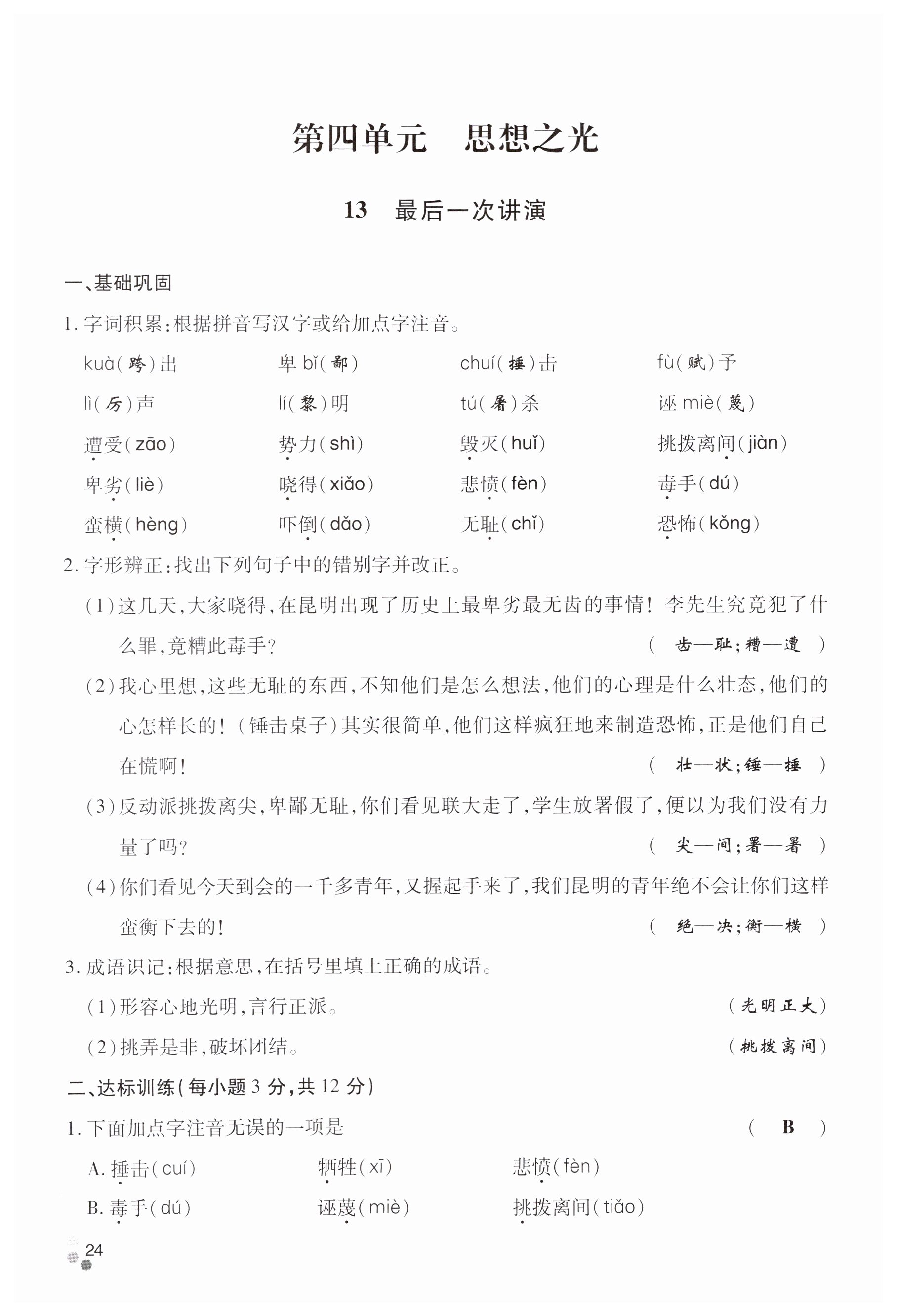 注:目前有些书本章节名称可能整理的还不是很完善,但都是按照顺序排列的,请同学们按照顺序仔细查找。练习册 2024年学典四川八年级语文下册人教版成都专版 答案主要是用来给同学们做完题方便对答案用的,请勿直接抄袭。