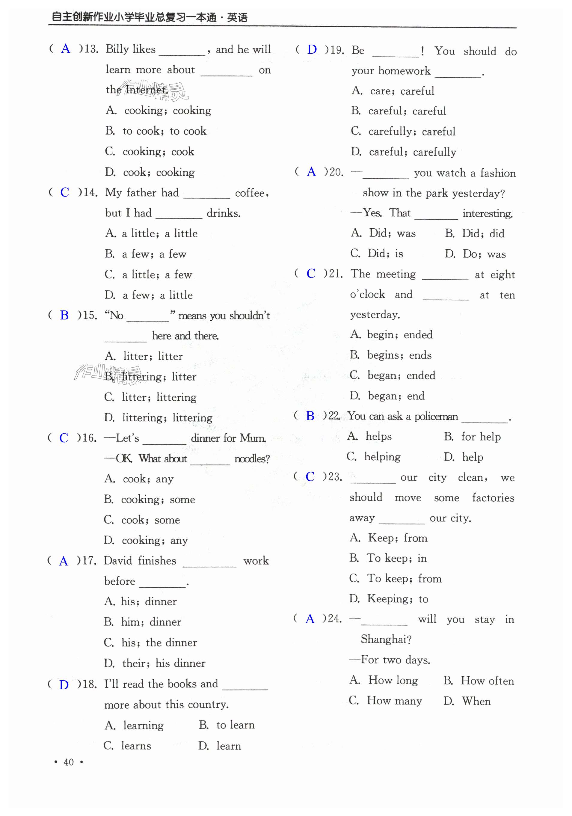 注:目前有些书本章节名称可能整理的还不是很完善,但都是按照顺序排列的,请同学们按照顺序仔细查找。练习册 2024年自主创新作业小学毕业总复习一本通英语译林版淮安专版 答案主要是用来给同学们做完题方便对答案用的,请勿直接抄袭。