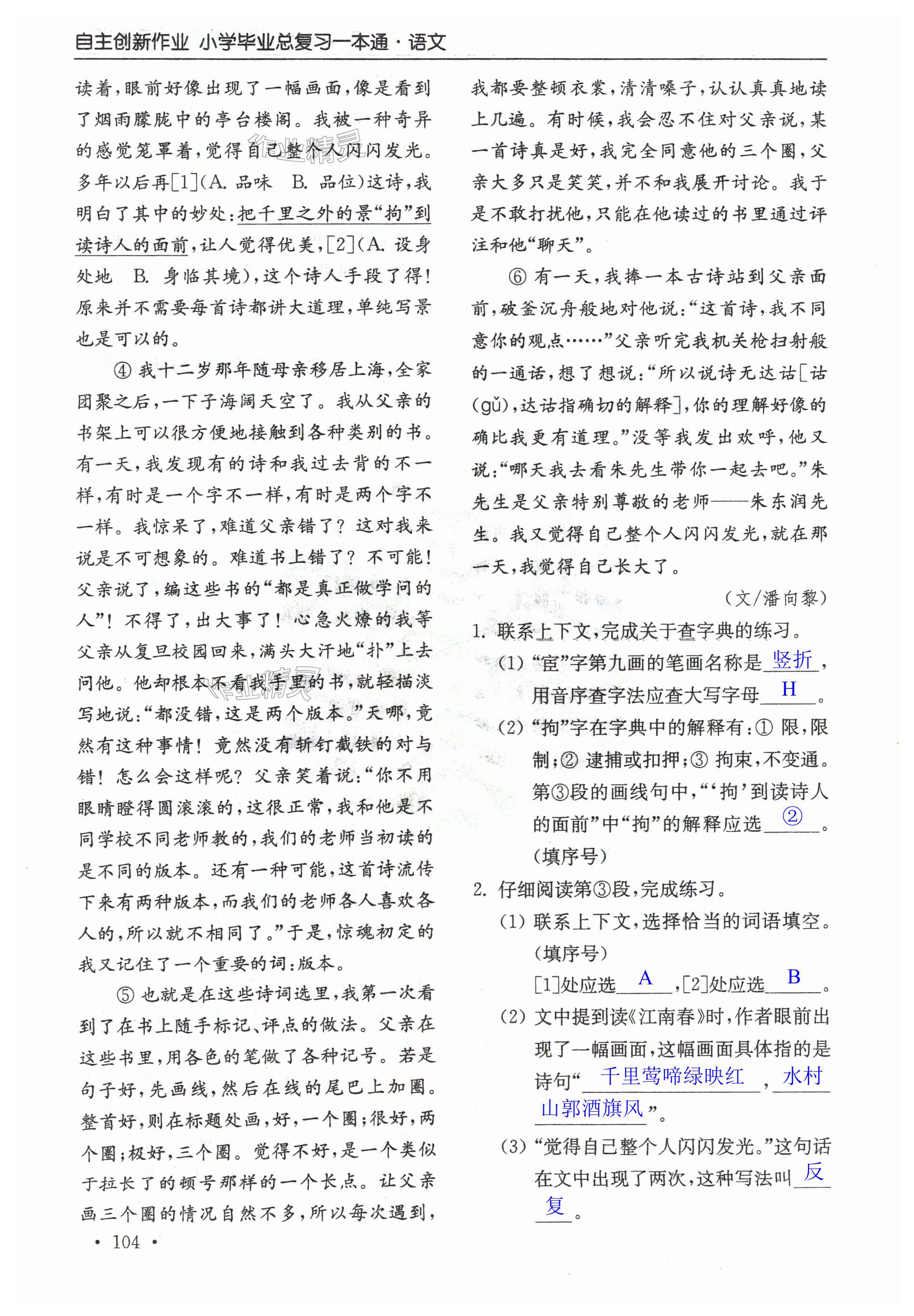 注:目前有些书本章节名称可能整理的还不是很完善,但都是按照顺序排列的,请同学们按照顺序仔细查找。练习册 2024年自主创新作业小学毕业总复习一本通语文淮安专版 答案主要是用来给同学们做完题方便对答案用的,请勿直接抄袭。