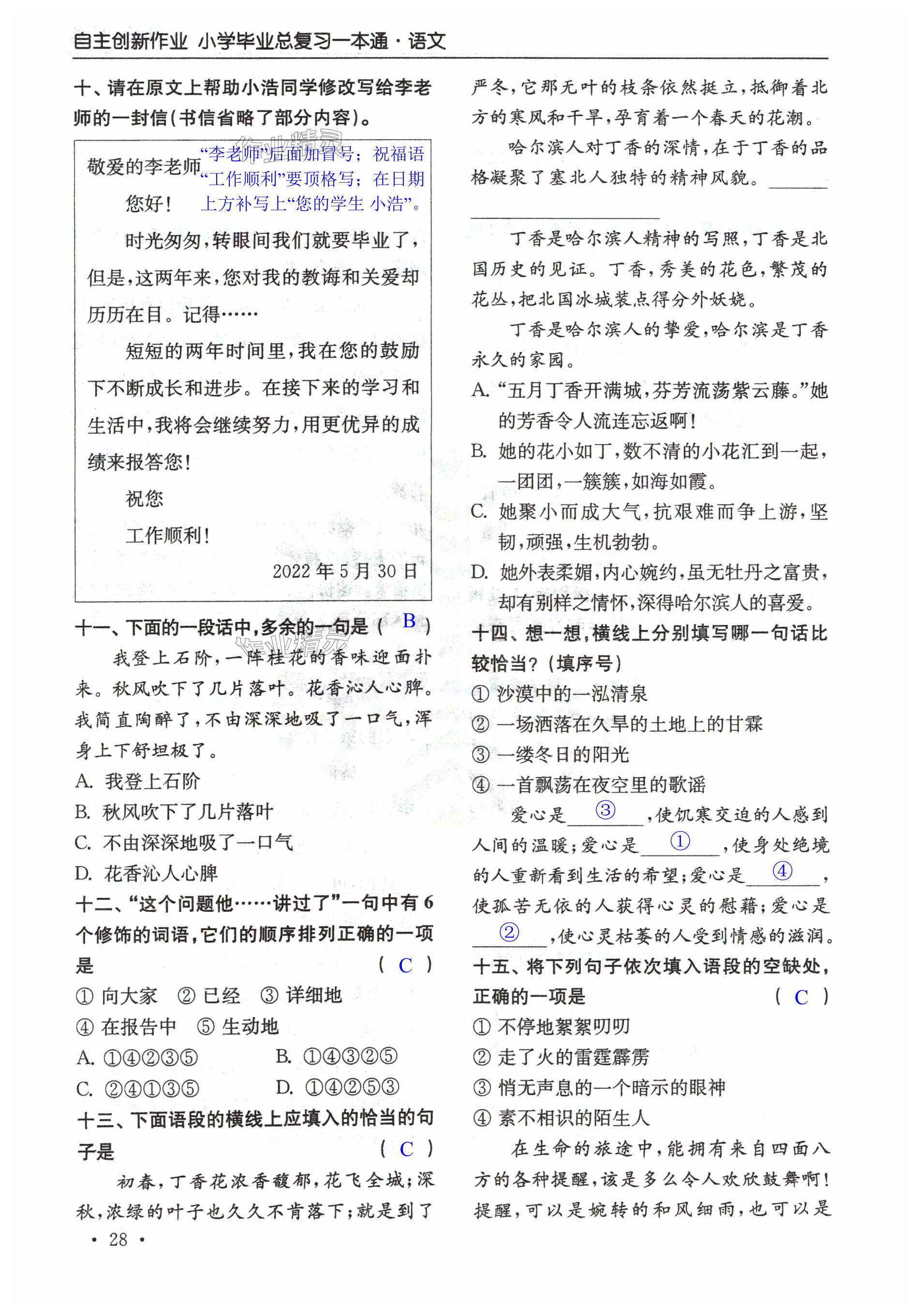 注:目前有些书本章节名称可能整理的还不是很完善,但都是按照顺序排列的,请同学们按照顺序仔细查找。练习册 2024年自主创新作业小学毕业总复习一本通语文淮安专版 答案主要是用来给同学们做完题方便对答案用的,请勿直接抄袭。