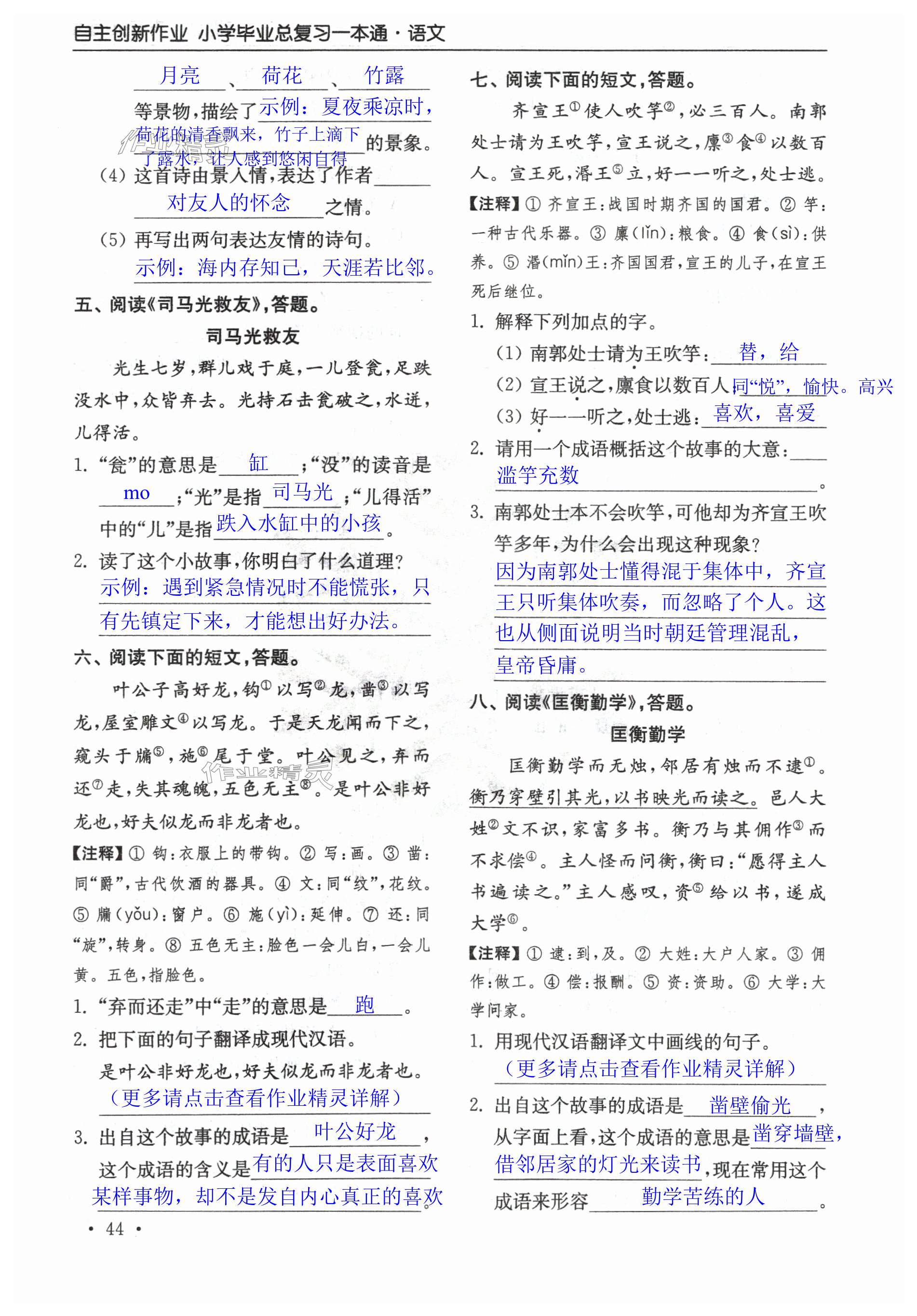 注:目前有些书本章节名称可能整理的还不是很完善,但都是按照顺序排列的,请同学们按照顺序仔细查找。练习册 2024年自主创新作业小学毕业总复习一本通语文淮安专版 答案主要是用来给同学们做完题方便对答案用的,请勿直接抄袭。