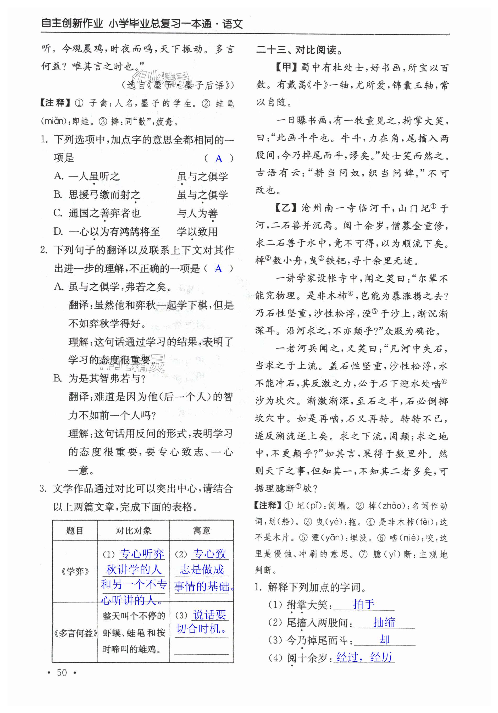 注:目前有些书本章节名称可能整理的还不是很完善,但都是按照顺序排列的,请同学们按照顺序仔细查找。练习册 2024年自主创新作业小学毕业总复习一本通语文淮安专版 答案主要是用来给同学们做完题方便对答案用的,请勿直接抄袭。