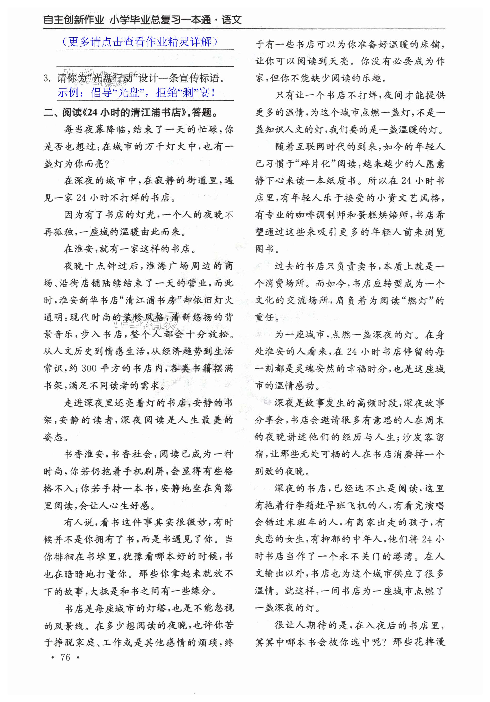2024年自主创新作业小学毕业总复习一本通语文淮安专版