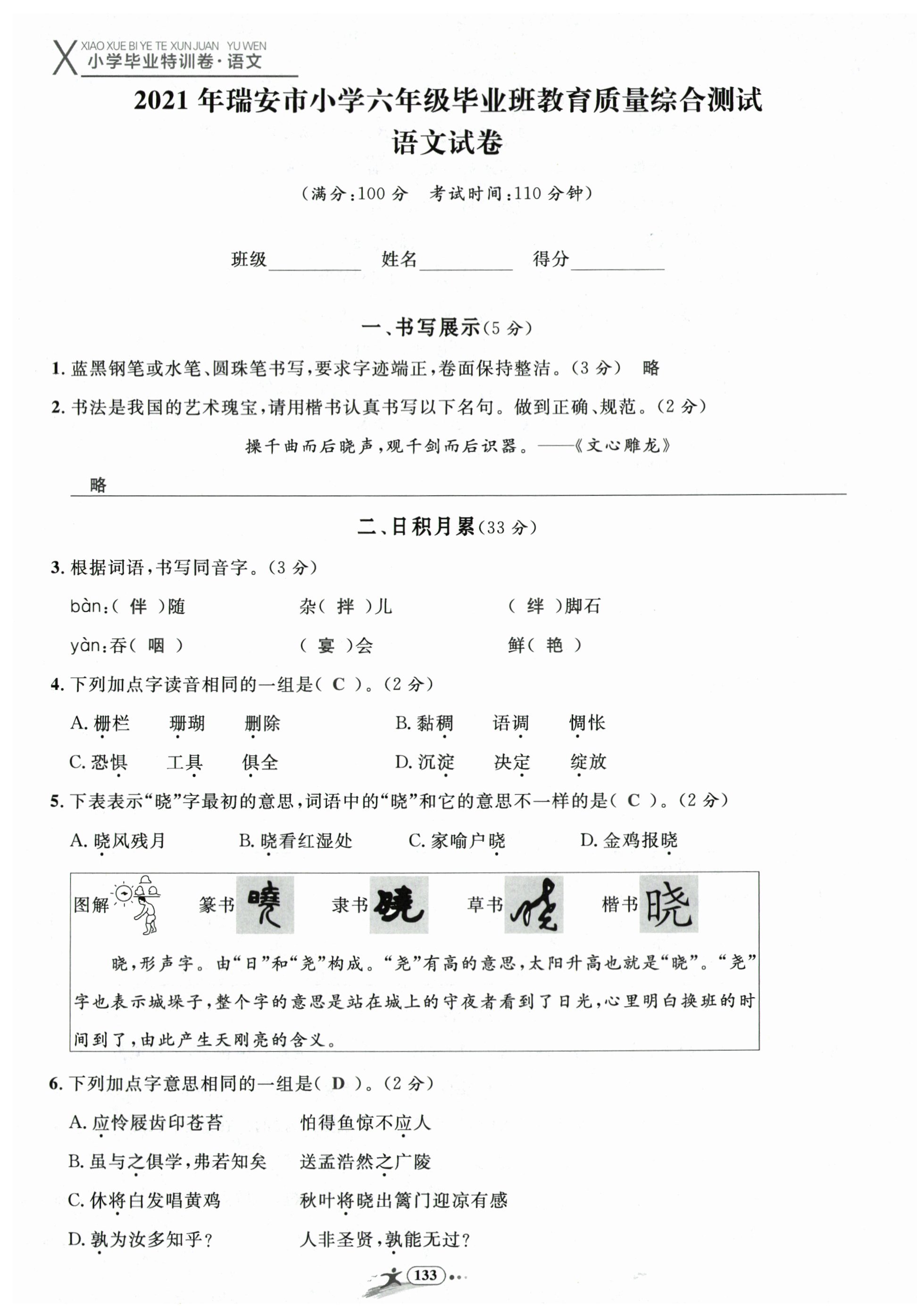 2024年小学毕业特训卷六年级语文温州专版