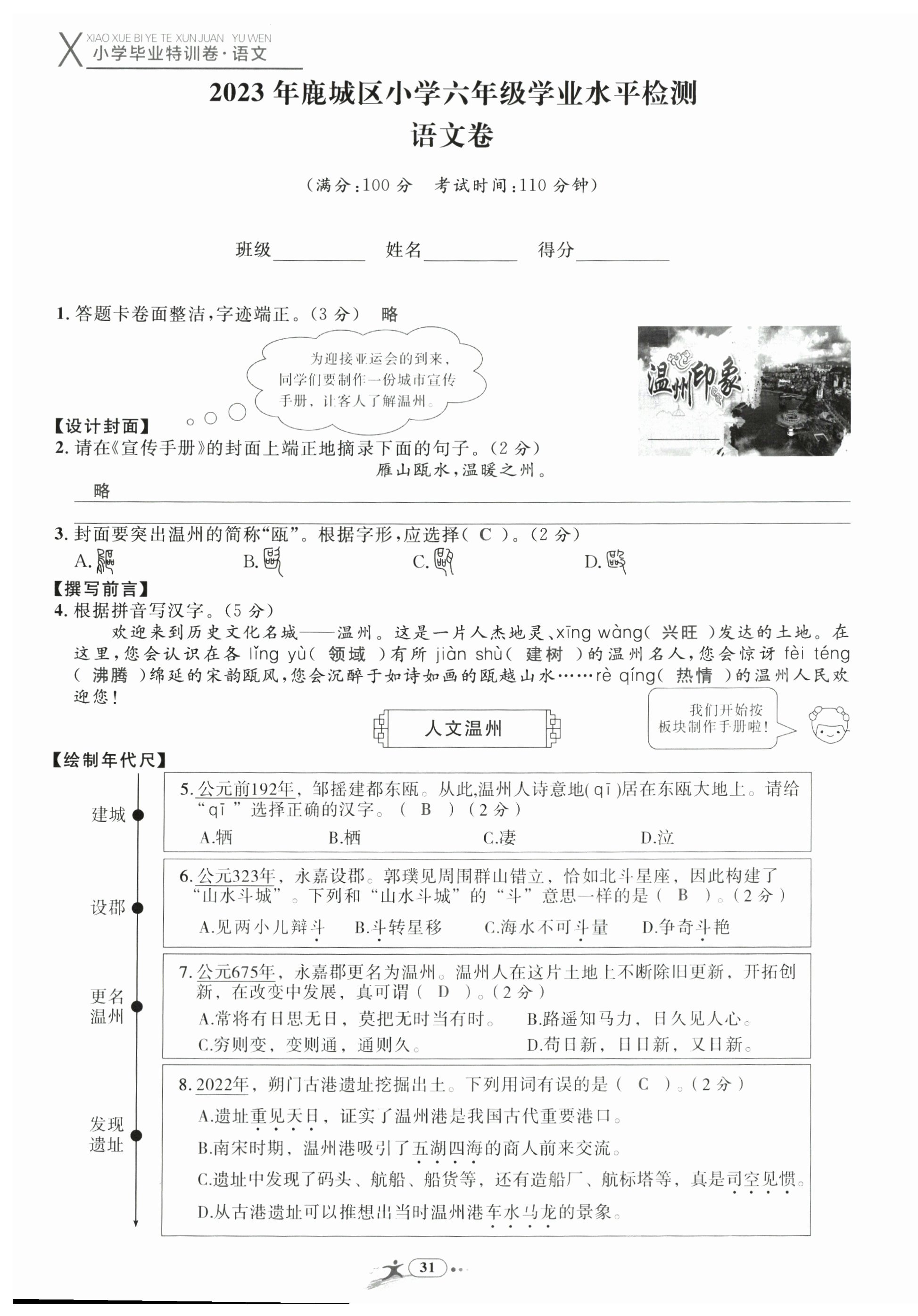 2024年小学毕业特训卷六年级语文温州专版